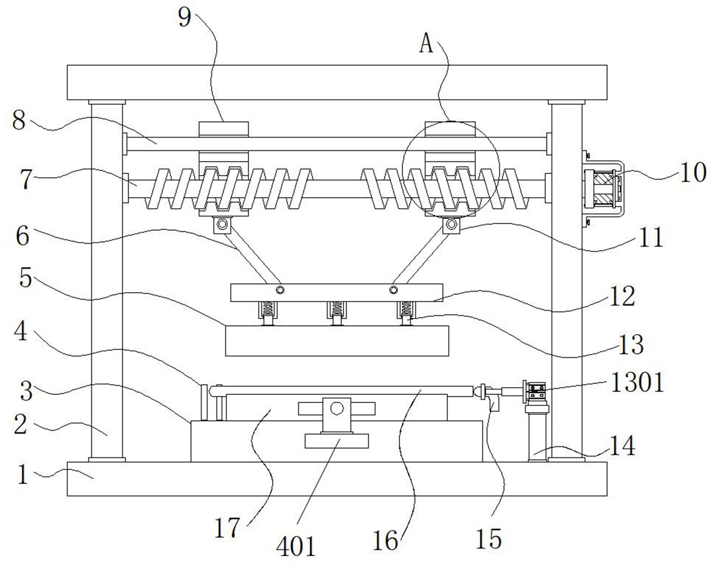 本实用新型公开了一种铜铝复合散热器制造用模具,包括底座和支撑架,所述底座顶端的两侧固定连接有支撑架,所述底座的顶端安装有下模具。该铜铝复合散热器制造用模具通过设置有升降杆,滑杆、滑套、伺服电机和安装块,需要把U形铜管嵌到安装槽的内部时启动伺服电机,伺服电机会带动螺纹杆正转,在螺纹杆的外部套接有滑套,螺纹杆正转时滑套会呈对向移动,当滑套呈对向移动时升降杆会通过铰接块使上模具和连接板下降,通过使上模具下降可以方便上模具对U形铜管按压,上模具对U形铜管按压可以使U形铜管嵌入安装槽的内部,U形铜管嵌入安装槽的内部则完成对U形铜管的安装,解决的是不方便对上模具进行升降,不方便拿取铝质散热基座的问题。