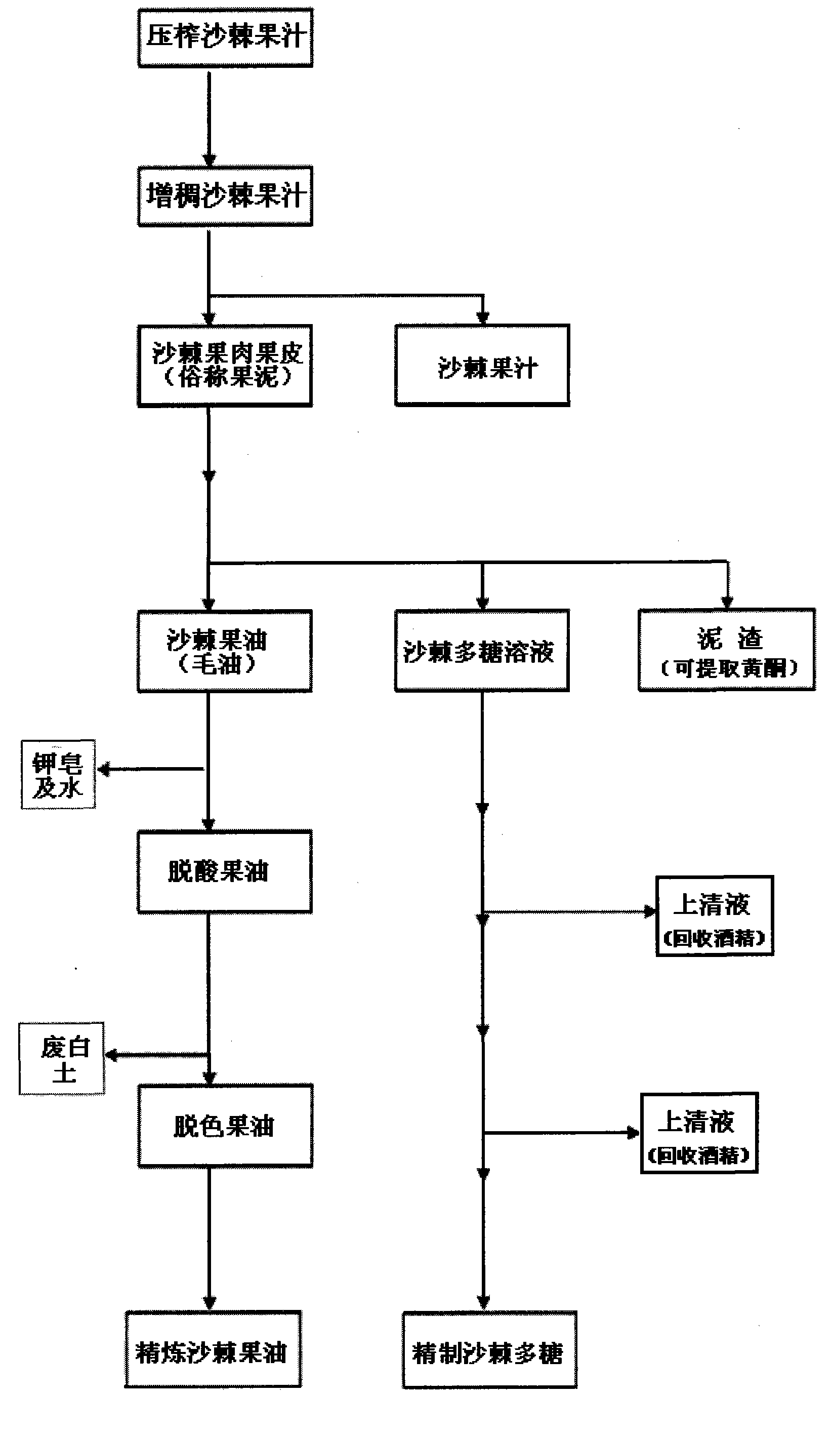 本发明涉及一种沙棘果中有益成分的提取技术,具体地说是涉及一种从沙棘果提取沙棘汁后的废料沙棘果泥中提取沙棘果油及沙棘多糖的联产提取方法。本发明一种沙棘果泥中果油及多糖联产提取方法包括如下步骤:(1)增稠;(2)果汁分离;(3)果泥析油;(4)固液分离;(4)脱酸;(5)脱色;(6)脱臭得最终产品精炼沙棘果油,得率50%。本发明是从提取了沙棘果汁后的沙棘果泥联合提取沙棘果油及多糖的联产提取方法,不仅使沙棘废料得到了充分利用,并且沙棘果油及多糖同时提取,工艺效率高,成本低。