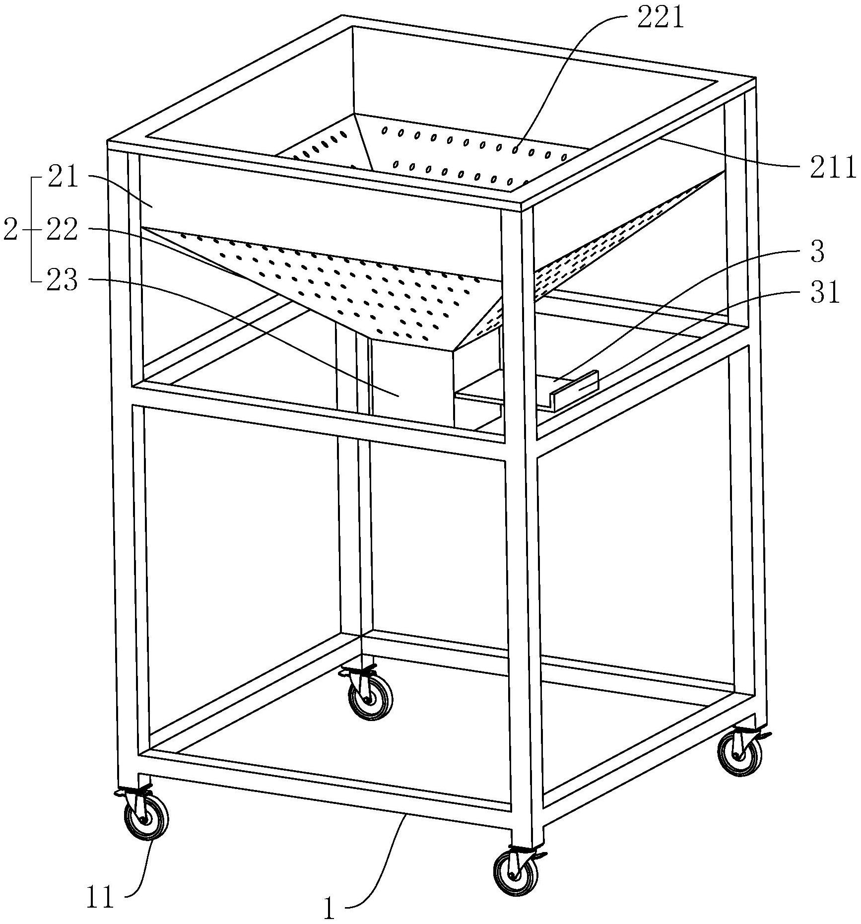本申请涉及一种轮式原料醒发斗,涉及醒发设备,其包括支架和设置于支架上的醒发斗本体,所述支架靠近地面一侧设置有多个脚轮,所述醒发斗本体包括口部、连接段以及底部,所述口部和底部均呈方管状,所述连接段呈倒置四棱锥台状,所述连接段的下底端侧连接于口部的一端侧,所述连接段的上底端侧连接于底部的一端侧,所述连接段的四壁贯穿开设有多个第一通风孔,所述底部设置有使其管口呈贯通或封闭状态的卸料机构。本申请具有提高整体原料的醒发效果的效果。