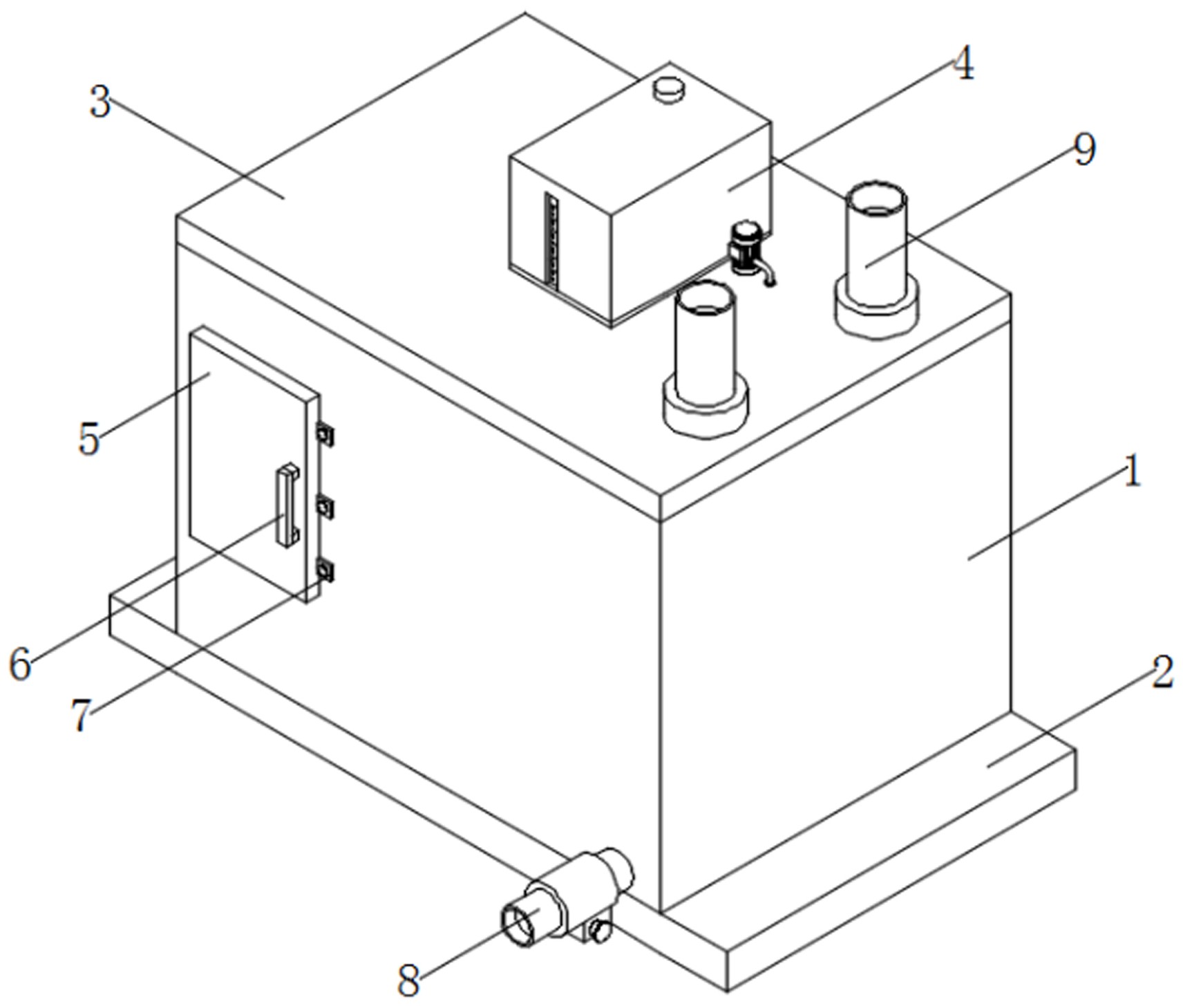 本实用新型污水处理装置技术领域,具体涉及一种朗德鹅养殖用污水处理装置,包括处理箱和盖板,盖板的上端中部安装有消毒水箱,消毒水箱的右侧安装有增压泵,增压泵的右侧安装有导液管。本实用新型克服了现有技术的不足,通过设置有消毒水箱、增压泵、导液管、喷管和喷嘴,使得进液管在进行进液的过程中,可以将消毒水箱内的水泵进行开启,同时将增压泵打开,使得可以利用导液管将消毒水箱内的消毒液传输到分导管内,再由分导管将消毒液传输到喷管内,最后有由喷管下端的各个喷嘴将消毒液进行喷洒出来,实现对处理箱内过滤的污水进行消毒工作,减少污水对外界的污染,提高了本装置的环保程度。