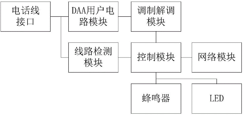本实用新型公开了一种检测电话线路并自动控制传真收发的装置,该装置包括电信接口、DAA用户电路模块、线路检测模块、调制解调模块、控制模块和网络模块;控制模块用于获取调制解调模块的工作状态信号,并根据工作状态信号和电压信号通过网络模块发送故障警报信号至外部的计算机设备,以及发送任务信号至调制解调模块,以使调制解调模块将任务信号通过DAA用户电路模块发送至电信接口。本实用新型的优点在于通过检测电话线是否故障,并据此决定传真文件信号收发的继续或停止,避免了重复尝试发送传真,也避免了在线路故障时仍持续保持在接收状态,提高了传真收发的效率。