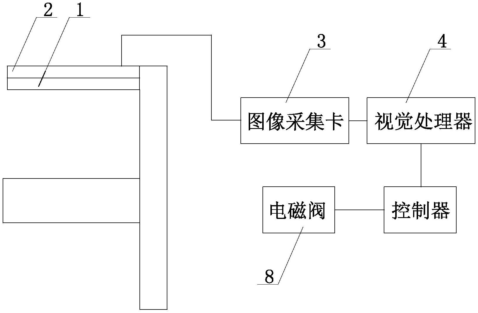 本实用新型涉及PVC手套视觉破损在线检测系统,属于PVC手套生产技术领域;包括破损检测模块、控制器和气动剔除模块,所述破损检测模块包括光源,还包括依次连接的镜头、相机、图像采集卡和视觉处理器;所述气动剔除模块设置在PVC手套生产线脱模位置后端的外侧部,包括从前到后的第一吹气部件、第二吹气部件和第三吹气部件,第一吹气部件出气口位于PVC手套顶部,第二吹气部件出气口位于PVC手套中部,第三吹气部件出气口位于PVC手套下部,第一吹气部件、第二吹气部件和第三吹气部件通过电磁阀连接气源,视觉处理器、控制器和电磁阀依次连接;通过视觉检测PVC手套脱模过程中是否破损并自动剔除,节省人力、检测准确率高。