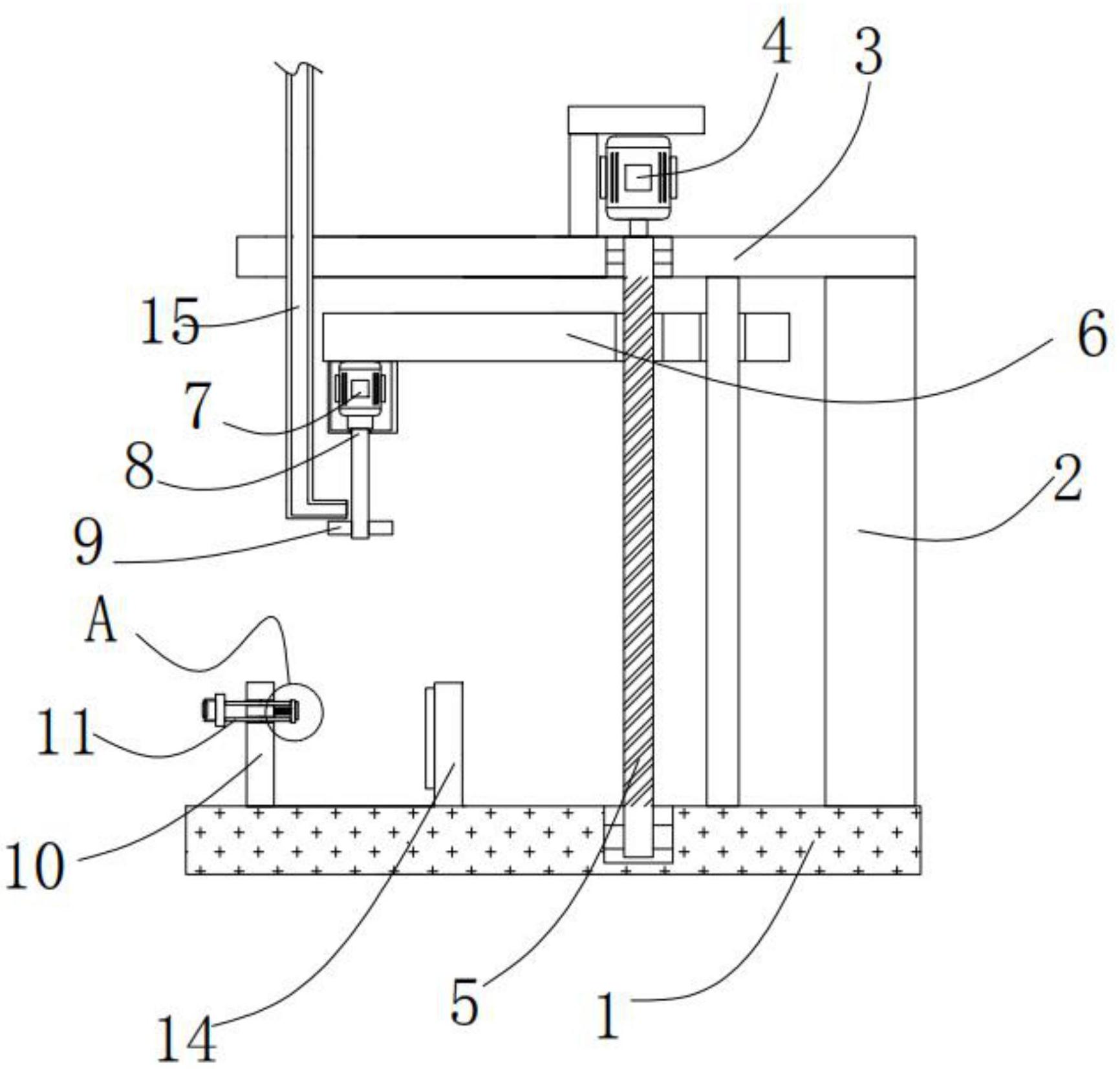 本实用新型提供一种基于驼乳粉发酵用立式浓奶罐的清洁装置。所述基于驼乳粉发酵用立式浓奶罐的清洁装置包括:底座;第一固定块,所述第一固定块固定安装在底座的顶部;第二固定块,所述第一固定块固定安装在第一固定块的顶部;第一电机,所述第一电机设置在第二固定块的顶部;螺纹杆,所述螺纹杆转动安装在底座与第二固定块上,所述螺纹杆的顶端与第一电机固定连接。本实用新型提供的基于驼乳粉发酵用立式浓奶罐的清洁装置具有可以对奶罐进行清洁,便于对奶罐进行固定的优点。
