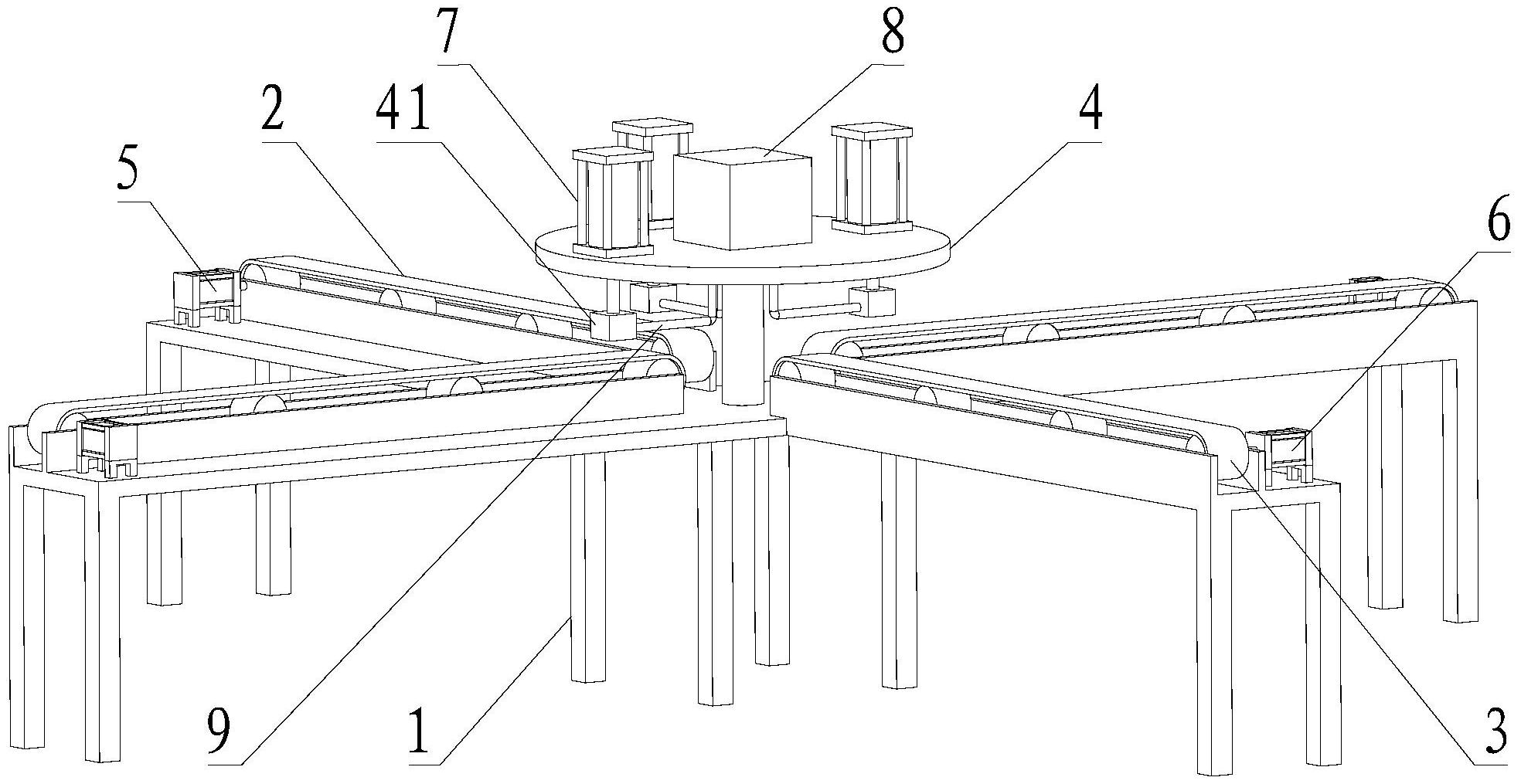 本实用新型涉及白茶加工技术领域,尤其涉及白茶包装袋交替送料装置,包括机架、进料带、出料带和转盘;两条以上所述进料带以及一条所述出料带均设置在所述机架上,所述进料带的出料端与所述出料带的进料端位于同一圆周上;所述转盘转动设置在所述机架上,所述转盘设有两组以上沿所述圆周运动的夹头。本实用新型提供的白茶包装袋交替送料装置相较于传统采用机械手逐个搬运包装袋的方式不仅提高了效率,而且降低了成本,可实现不同规格白茶包装袋高效、连续、交替送料。