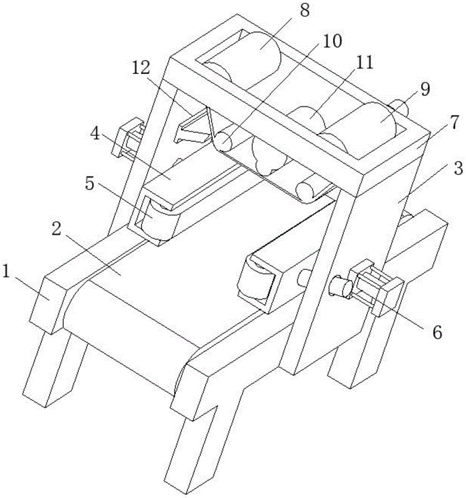 本实用新型公开了植物果肉生产技术领域的植物果肉不破坏分子结构生产中自动贴标装置,包括支架和贴标输送台,所述贴标输送台转动连接于支架的内部,所述支架的两侧壁均竖直安装有立板,所述立板的内侧设有定位框,所述定位框的内部转动连接有定位皮带,所述支架的外侧壁安装有液压缸,两组所述立板之间安装有安装框,所述安装框的内部分别设有放标签轮、回收轮、两组张紧轮和贴标凸轮,所述张紧轮的一侧设有安装于立板内壁的剥离刀片,结构简单,自动化程度高,通过将植物果肉包装品通过定位皮带进行输送和贴标的准确定位,液压缸带动定位框相对进行移动,可满足对于不同包装盒规格的调节,输送稳定性高,大大提高了生产效率。