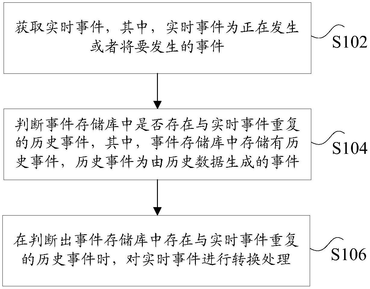 本发明公开了一种事件处理方法和装置。其中,该方法包括:获取实时事件,其中,实时事件为正在发生或者将要发生的事件;判断事件存储库中是否存在与实时事件重复的历史事件,其中,事件存储库中存储有历史事件,历史事件为由历史数据生成的事件;以及在判断出事件存储库中存在与实时事件重复的历史事件时,对实时事件进行转换处理。本发明解决了相关技术在流计算过程中由历史数据生成的历史事件与实时事件有可能重复,导致流计算准确度降低的技术问题。