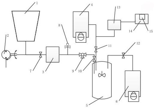 本实用新型公开了一种生产聚葡萄糖的投料装置,属于聚葡萄糖生产技术领域。该投料装置包括储料仓、绞龙机、称重罐、真空泵Ⅰ、反应釜和真空泵Ⅱ,储料仓分别与绞龙机和称重罐通过管道连接,称重罐、真空泵Ⅰ和真空泵Ⅱ分别与反应釜通过管道连接;储料仓与称重罐间的管道上设有阀门Ⅰ,称重罐与反应釜间的管道上设有阀门Ⅱ,真空泵Ⅰ与反应釜间的管道设有阀门Ⅲ,真空泵Ⅱ与反应釜间的管道设有阀门Ⅳ。两台连接反应釜的真空泵分别控制吸料和负压反应,对比正压聚合,显著减少了正压反应时真空泵对粉尘的外吸,且负压反应提高了反应过程安全性,全程负压抽料,可预防正压送料时上料管道卡扣间粉尘外溢。