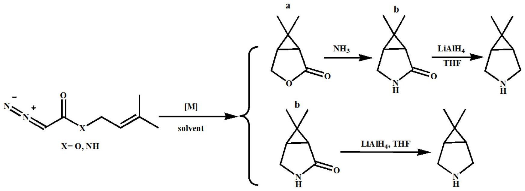本发明涉及一种氮杂双环药物中间体,尤其是涉及一种6,6‑二甲基‑3‑氮杂双环[3.1.0]己烷或其衍生物的合成方法,通过分子内重氮基团与烯键环化构建杂原子双环化合物,并经由(胺化反应和)还原反应最终得到目标产物。