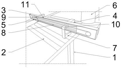本实用新型提供风管玻璃棉切割装置,它包括有机台、切刀,其中,机台顶部安装有输送辊,输送辊上方安装有横切梁,横切梁一侧活动安装有切刀座,切刀座底部安装有切刀,横切梁另一侧安装有传动链条,传动链条由传动电机带动旋转,切刀座为两组,均由传动链条带动沿输送辊宽度方向行走,切刀座的输出端底部安装有导向定位板,两块导向定位板之间形成切割导向区。采用本方案后的导向定位板与切刀同步调整,从而降低整个装置的调节难度,可操作性大大提高。
