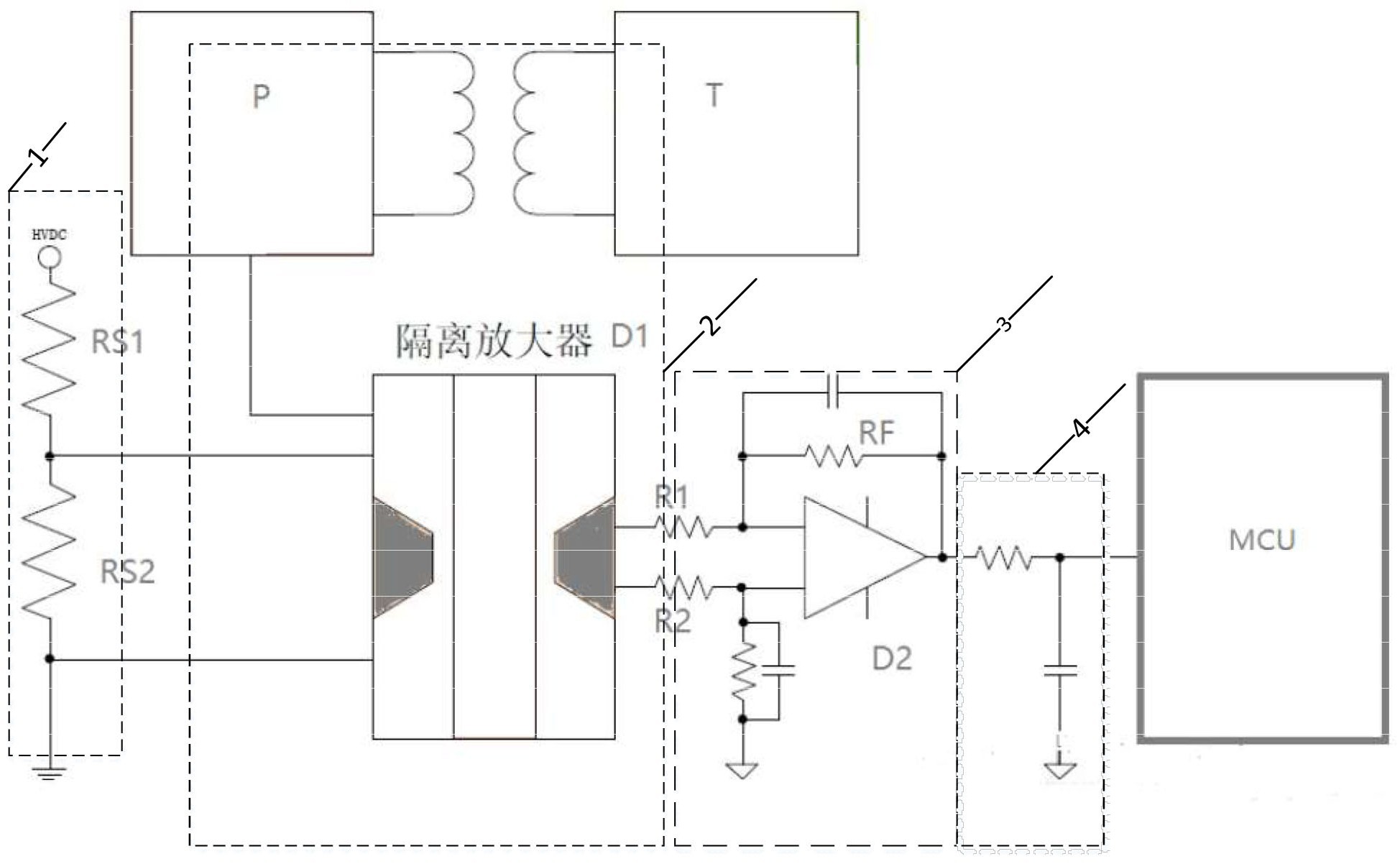 本申请提供一种直流充电桩母线高压隔离采样电路,包括分压电路、隔离电路、差分放大电路和滤波电路;所述分压电路一端连接直流充电桩母线高压输出端,另一端连接隔离电路;所述隔离电路包括隔离放大器、隔离电源和变压器;所述隔离电源连接隔离放大器的输入端,所述变压器连接隔离放大器的输出端,所述隔离电源与变压器耦合,所述隔离放大器的输出端连接差分放大电路的输入端,所述差分放大电路的输出端连接滤波电路,所述滤波电路连接MCU的信号采集接口。将充电桩端的高压进行1:1分压后采用隔离放大器进行隔离采集,通过极低的失调电压和增益误差,确保了其在全温度范围内的采样精度。