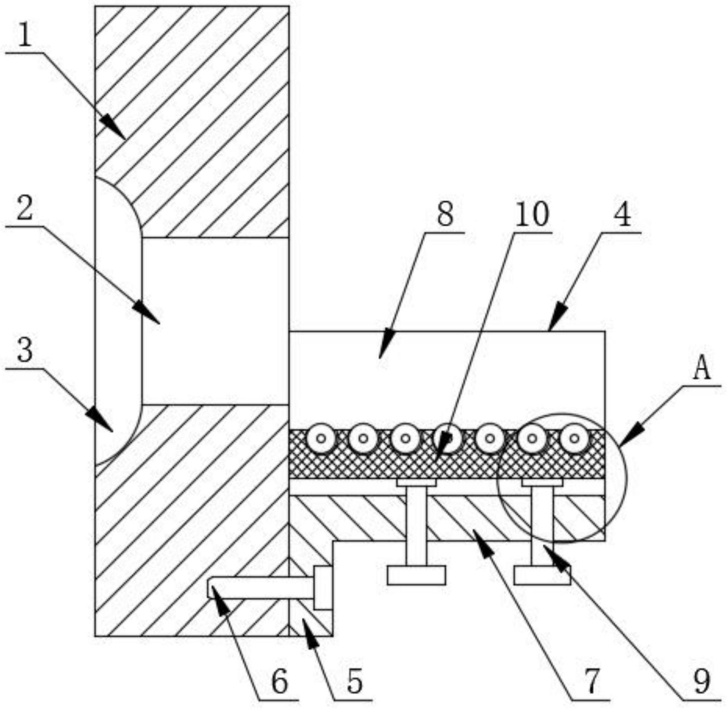 本实用新型涉及铸造模具技术领域,具体为一种多腔铝型材模具,包括挤出模具前端安装的支撑件,支撑件包括下端的连接板,连接板呈半圆形,连接板上开设有固定孔,固定孔内连接固定螺栓,连接板贴合连接在挤出模具外侧下端并通过固定螺栓固定连接,有益效果为:通过设置支撑件可以将刚挤出的铝型材承托住,保证铝型材挤出顺利性,防止铝型材受重力或碰撞产升弯折或变形,保证产品挤出后的质量,增加使用效果,而且便于安装拆卸,以便于根据不同规格铝型材更换带有合适托板的支撑件,增加使用便利性。
