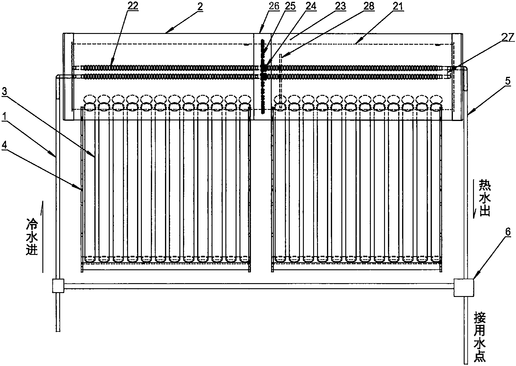 本实用新型涉及一种无菌承压型太阳能热水系统,包括冷水进水管、贮热水箱、太阳能集热器、恒温阀,其特征在于:所述贮热水箱由两台或两台以上小水箱拼接而成,其中一台小水箱接冷水进水管,另一台接热水出水管,热水出水管上设有恒温混水阀,每个小水箱内均设有水平放置的若干支波节管组成的换热器,相邻两个小水箱之间的波节管用承插活接头组件连接在一起,相邻两个小水箱之间的内胆翻边成平面后用法兰组件连接,外壳用金属密封条密封;系统集集热、贮热、换热、用热为一体,解决了传统太阳能热水系统水质污染、水压不稳定、建设成本高、运行成本高,解决了水温不可控,水温过高易导致管道老化,影响系统使用寿命等一系列问题。