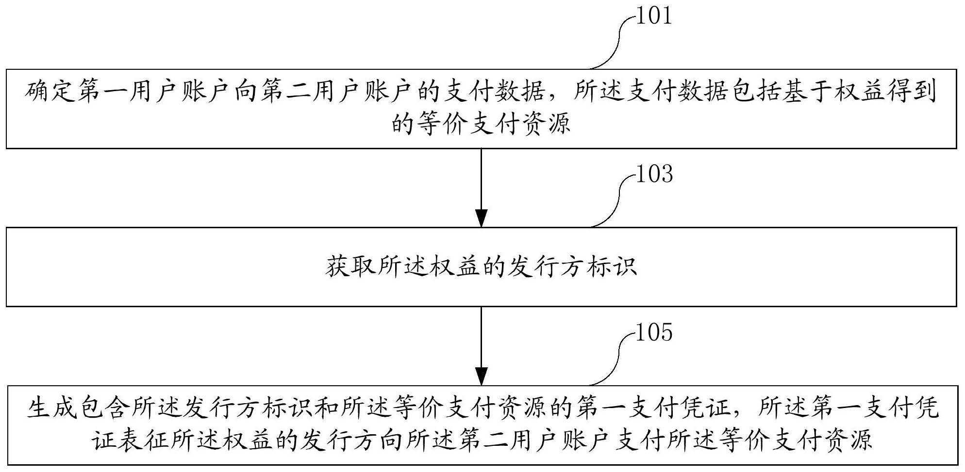 本说明书实施例公开了一种支付数据的处理方法、装置及电子设备,本实施例方案应用在支付机构,具体可以包括:如果第一用户账户向第二用户账户的支付数据中包括基于所述权益得到的等价支付资源,获取所述权益的发行方标识,生成包含发行方标识和等价支付资源的第一支付凭证,第一支付凭证表征所述权益的发行方向所述第二用户账户支付所述等价支付资源。
