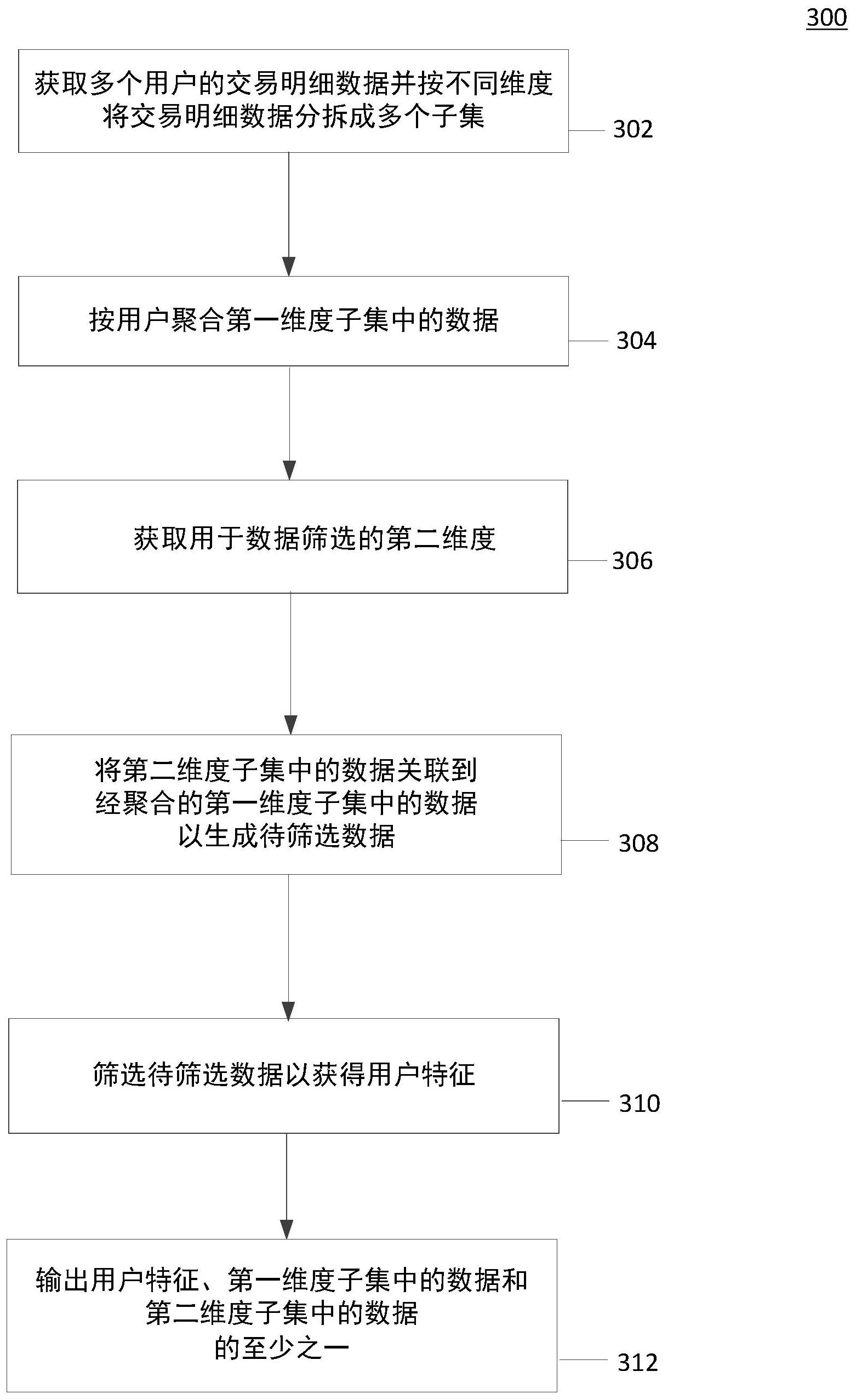 本公开提供了一种基于数据仓库的用户特征产出方法,包括:获取多个用户的交易明细数据并按不同维度将该交易明细数据分拆成多个子集;按用户聚合第一维度子集中的数据;获取用于数据筛选的第二维度;将第二维度子集中的数据关联到经聚合的第一维度子集中的数据以生成待筛选数据;筛选该待筛选数据以获得用户特征;以及输出用户特征、第一维度子集中的数据和第二维度子集中的数据的至少之一。