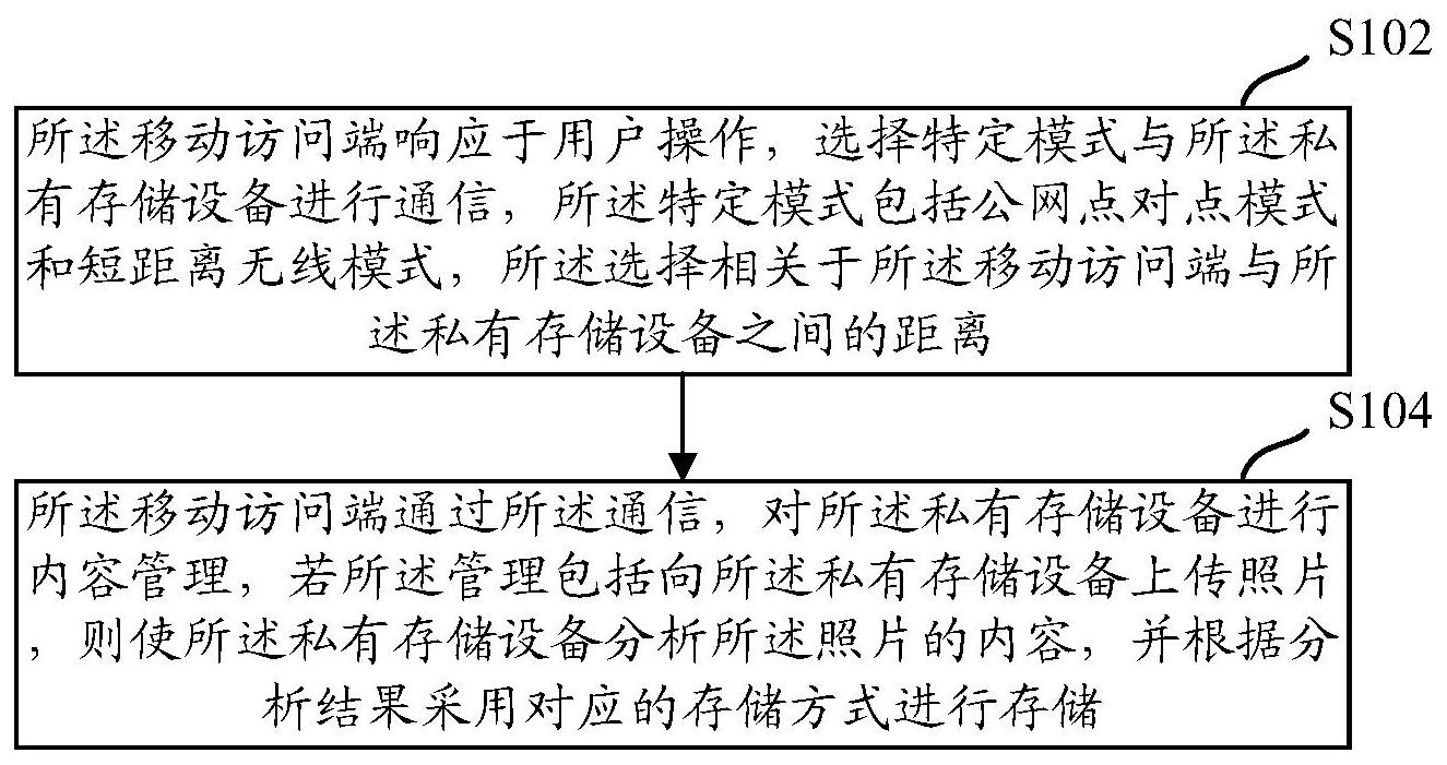 本说明书实施例公开了一种多人共享的照片存储方法、装置以及设备。方案应用于包括私有存储设备和一个或者多个移动访问端的共享系统,包括:移动访问端响应于用户操作,选择特定模式与私有存储设备进行通信,特定模式包括公网点对点模式和短距离无线模式,该选择与移动访问端和私有存储设备之间的距离相关;移动访问端通过通信,对私有存储设备进行内容管理,若管理包括向私有存储设备上传照片,则使私有存储设备分析照片的内容,并根据分析结果采用对应的存储方式进行存储。