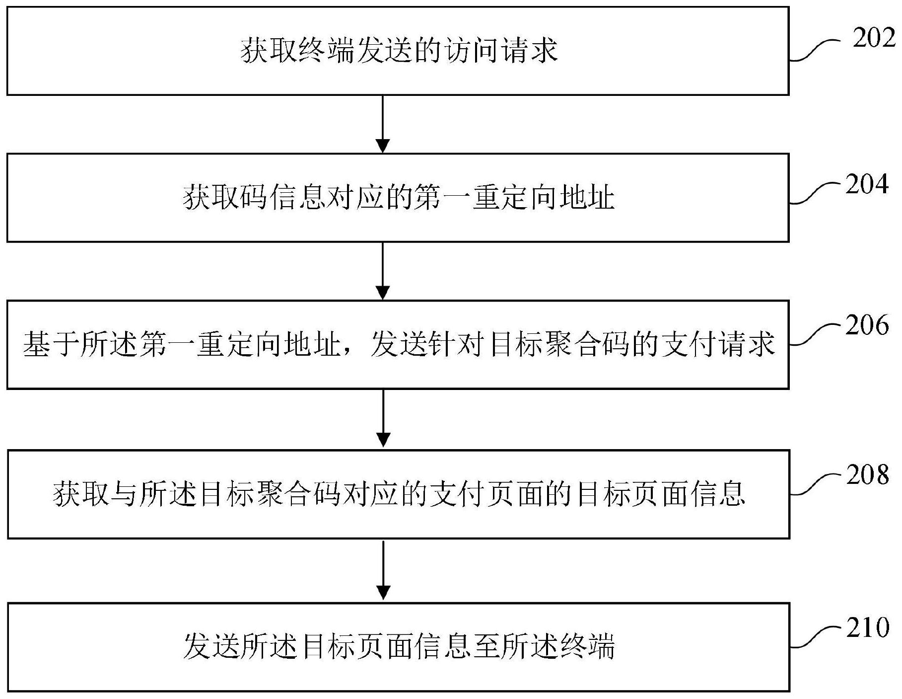 本说明书实施例公开了一种聚合码的支付页面的访问方法、装置、设备及介质。方案包括:第一服务器获取终端发送的访问请求;所述访问请求是所述终端扫描目标聚合码生成的;所述访问请求包含所述目标聚合码的码信息和所述终端的终端标识;获取所述码信息对应的第一重定向地址;基于所述第一重定向地址,发送针对所述目标聚合码的支付请求;获取与所述目标聚合码对应的支付页面的目标页面信息;发送所述目标页面信息至所述终端。