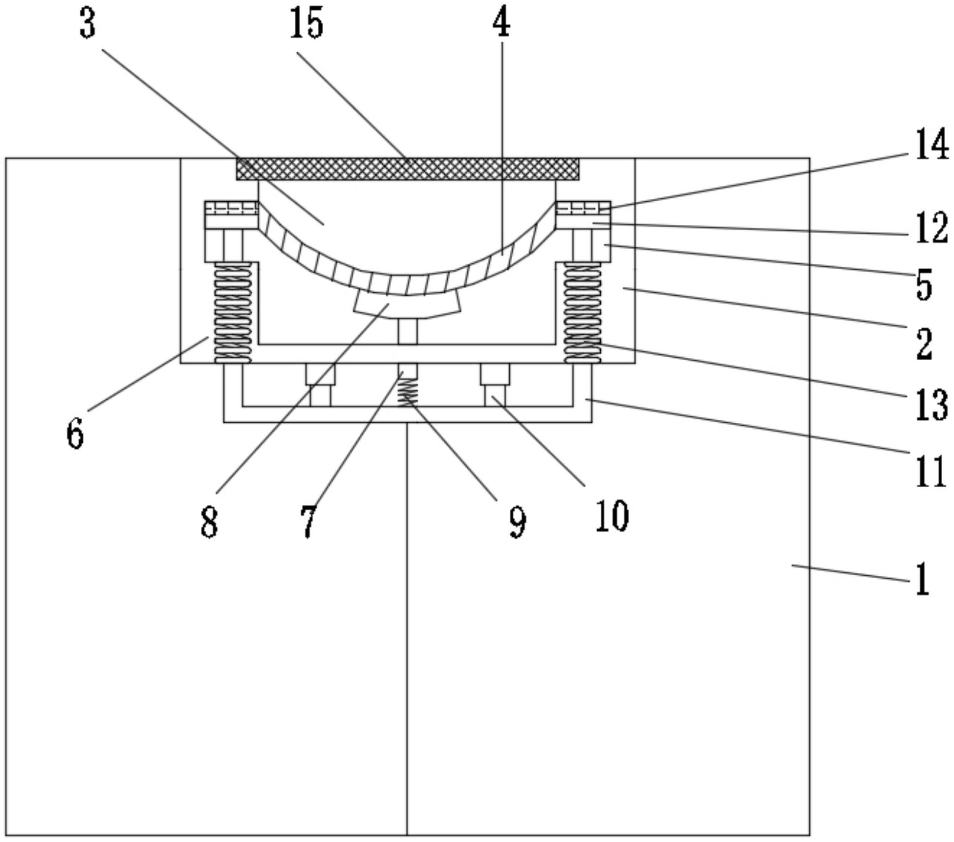 本实用新型公开了一种活动板房拼装间隔排水结构,包括板房、基板、水槽和联动压持装置,所述板房之间设有槽孔,所述基板设于板房的侧壁上,所述水槽设于槽孔中,所述基板上设有凹槽,所述联动压持装置设于基板上且能够对水槽进行压持。本实用新型属于板房技术领域,具体是指一种快速安装拆除,防止漏水的活动板房拼装间隔排水结构。