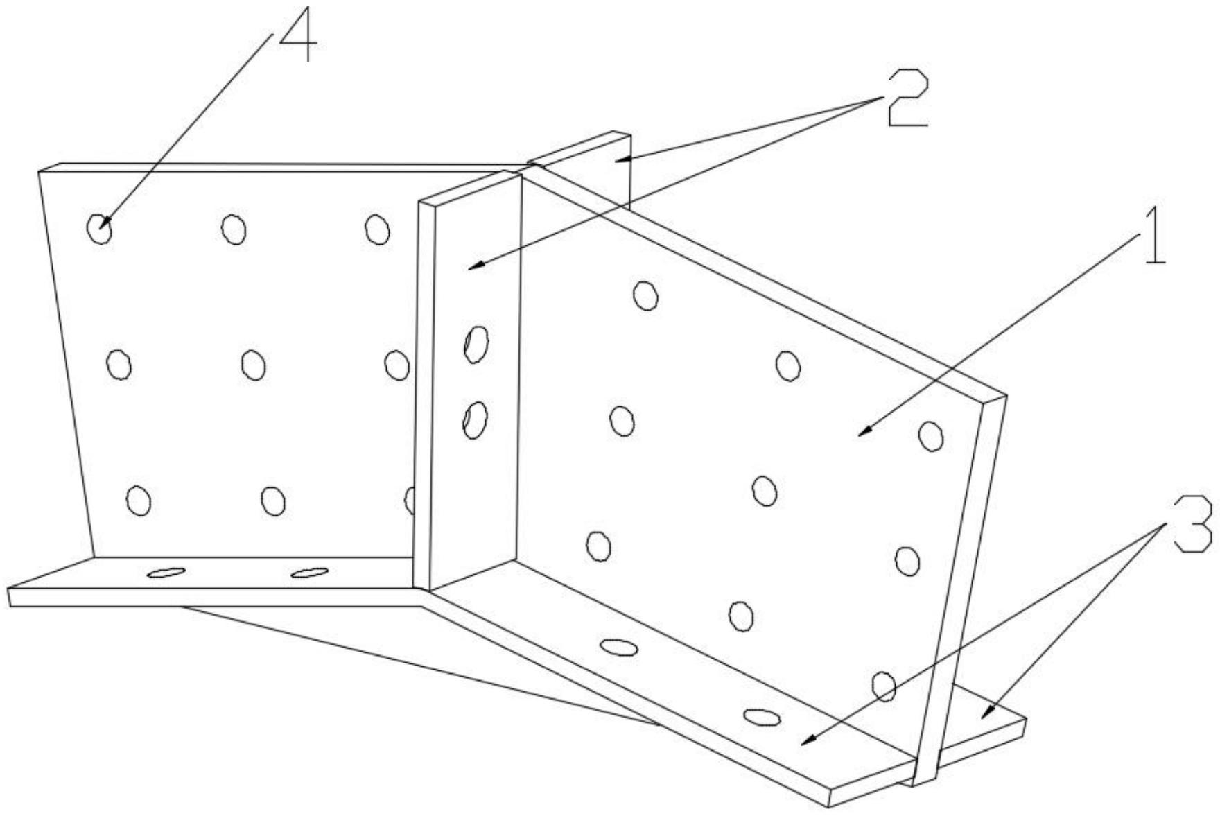 本实用新型提供了一种屋脊钢梁连接件,该屋脊连接件包括相互焊接连接而成的第一连接板、第二连接板和第三连接板,两个第二连接板或两个第三连接板对称固定在第一连接板的两侧,使该屋脊连接件呈轴对称结构,各个板之间相互焊接连接使结构更加稳定,第一连接板的顶端设有第一斜边和第二斜边,使该连接件连接两个钢梁后,两个钢梁之间呈一定角度,第三连接板一侧与第一斜边相互平行,第三连接板的另一侧与第二斜边相互平行,使第一连接板与钢梁固定连接后,第三连接板对钢梁进一步固定,使整个结构更加稳定,第一连接板、第二连接板和第三连接板上均设有通孔,用于连接螺栓,该屋脊连接件在能够保证屋脊结构稳定的同时,更便于拆卸。
