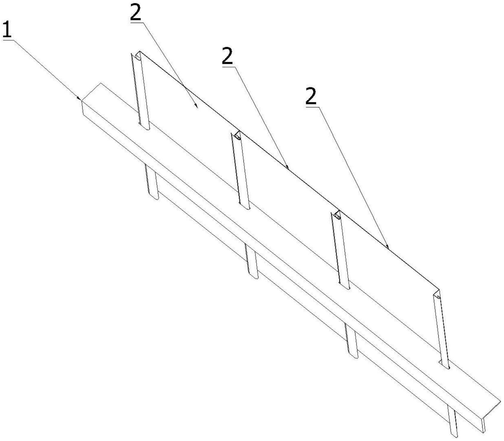 本实用新型提供了一种装配式围挡板装置,包括围挡板,所述围挡板包括第二支板,所述第二支板的一侧设有第一支板,所述第二支板的另一侧设有第三支板,所述第一支板和所述第三支板均与所述第二支板垂直且固定连接,所述第一支板的下端设有第一卡槽,所述第三支板的下端设有第二卡槽,两个所述围挡板之间通过所述第一卡槽和所述第二卡槽卡紧连接。本实用新型的技术方案通过对龙骨结构进行改进,设置插接口和档杆,同时对围挡板结构进行改进,设置第一卡槽、第二卡槽和挡板,实现围挡板与龙骨卡接,无需打钉固定,现场卡接,安装效率高,重复利用无配件损耗。