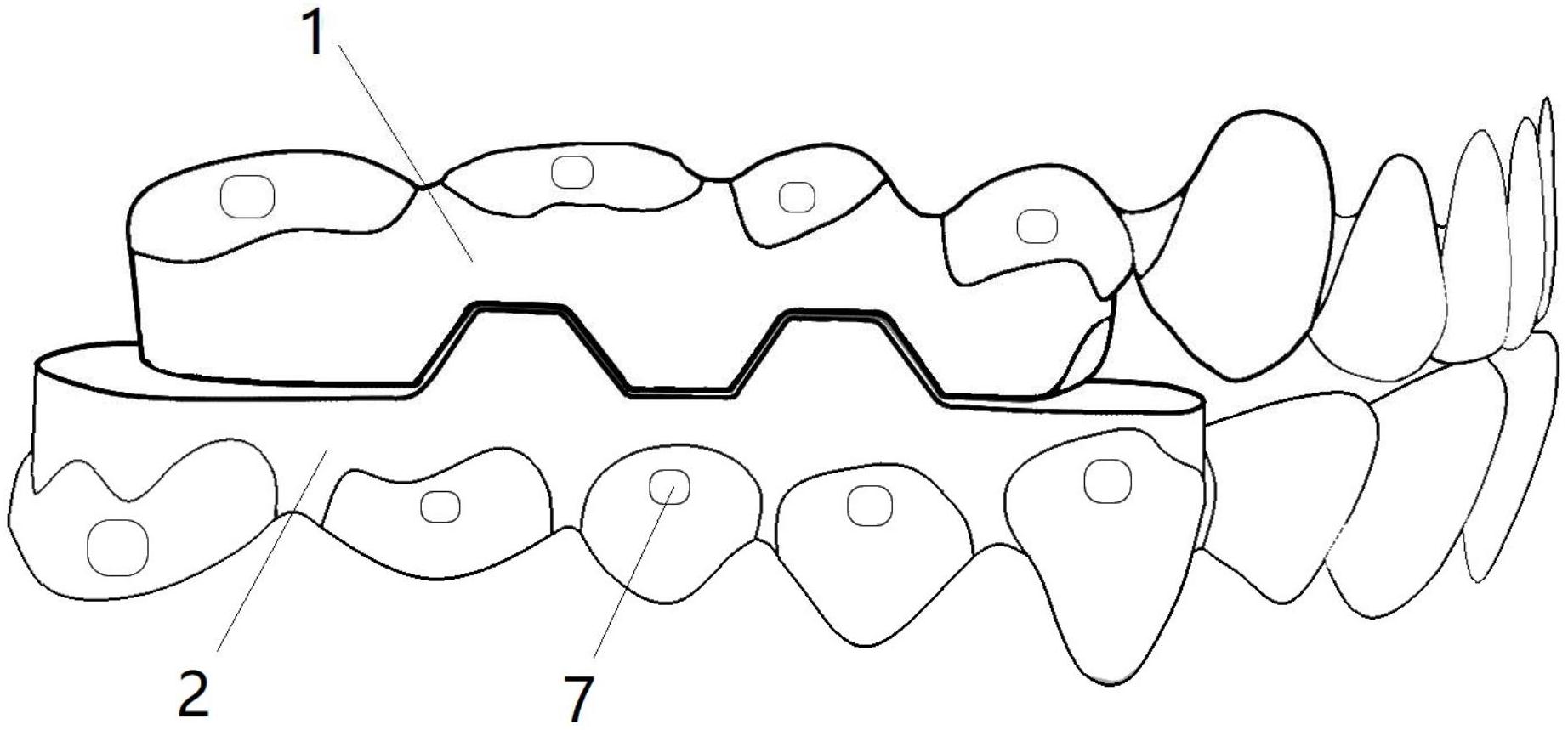本实用新型实施例涉及口腔医疗设备领域,公开了一种畸形牙矫治器,包括:第一矫治件、第二矫治件。第一矫治件具有用于包覆上颌需矫治牙齿齿面的空腔,第一矫治件背离空腔一侧具有第一咬合面;第二矫治件具有用于包覆下颌需矫治牙齿齿面的空腔,第二矫治件背离空腔一侧具有第二咬合面;第一矫治件与第二矫治件相对设置在上颌需矫治牙齿与下颌需矫治牙齿上,且上颌牙齿与下颌牙齿相互咬合后,第一矫治件的第一咬合面与第二矫治件的第二咬合面相互契合。本实用新型中的畸形牙矫治器,避免牙齿的咬合力降低,且可以缩短矫治时间,又保证了患者牙齿的安全。