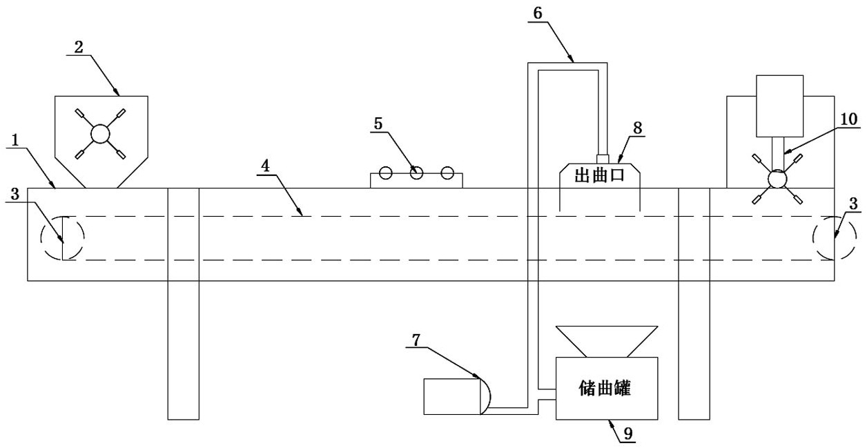 本实用新型属于茶叶加工机械技术领域,具体涉及一种茶叶潮水接菌种设备。本装置是沿水槽纵向中装入输送机,输送机的传送带一端上方设置加料斗,传送带另一端上方设置翻料机,翻料机的工作部件伸入茶叶中,传送带中部上方分别设置有补水喷头和菌种的出曲口,靠翻料机端的传送带接至茶叶发酵装置,补水喷头和出曲口的管路阀门连接着电子控制器。本实用新型结构简单,可避免传统的茶叶潮水不足和靠人力补水缺陷,菌种和水分喷散均匀,可实现潮水和接种同步进行,提高效率。