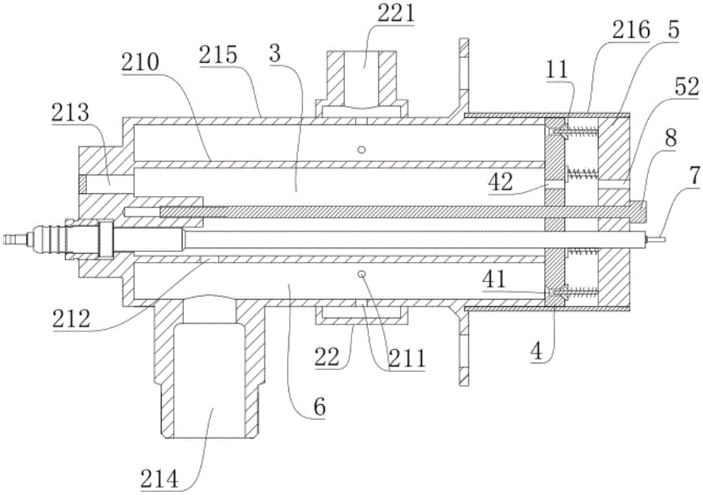 本实用新型公开了一种预混燃烧器,包括壳体、盖板、点火器;壳体呈开口向右的筒状,壳体内密封连接有环形分隔壁,壳体与环形分隔壁之间形成有混合腔,壳体的左部和右部分别设有空气连接口和燃气进气孔,燃气进气孔和空气连接口均与混合腔连通;环形分隔壁内形成有内腔,环形分隔壁上设有空气进气孔,空气进气孔与空气连接口相邻设置;盖板与壳体、环形分隔壁均密封连接;盖板上设有第一空气出孔、活塞通孔;点火器的左部设于内腔中,点火器的头部设于盖板的右方。燃气和部分空气从活塞通孔释放到点火器的头部的旁侧被点燃;另一部分空气通过空气进气孔进入内腔,从第一空气出孔流出,对点火器进行冷却,防止燃气回流到内腔中。