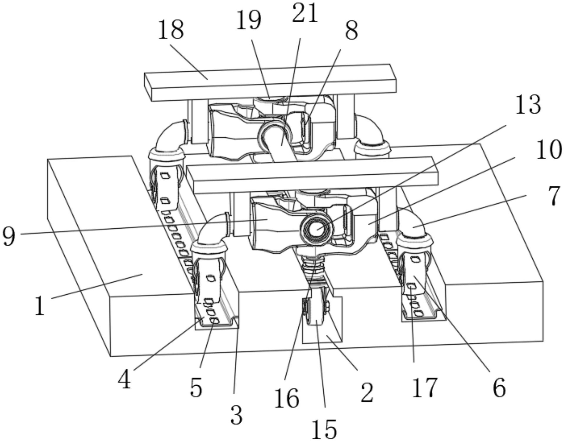 本实用新型涉及滑行装置技术领域,具体为一种电动门的平稳滑行装置,包括底座,所述底座的上表面开设有第一滑动槽和第二滑动槽,所述第二滑动槽的数量有两个,两个所述第二滑动槽的内部均固定连接有滑轨,两个所述滑轨的表面均开设有圆形孔,所述圆形孔的内部搭接有第一活动脚轮,所述第一活动脚轮的数量有两个。本实用新型的优点在于:通过在底座的上表面设置带有第二活动脚轮和第一活动脚轮的第一滑动槽和第二滑动槽,在第一活动脚轮的外表面设置圆块,又在滑轨的内部开设与圆块相适配的圆形孔,且在脚轮连接柱的表面设置脚轮限位板与第一滑动槽的上表面搭接,并在第一固定孔的内部固定设置电动伸缩杆,实现了电动门平稳滑行的目的。