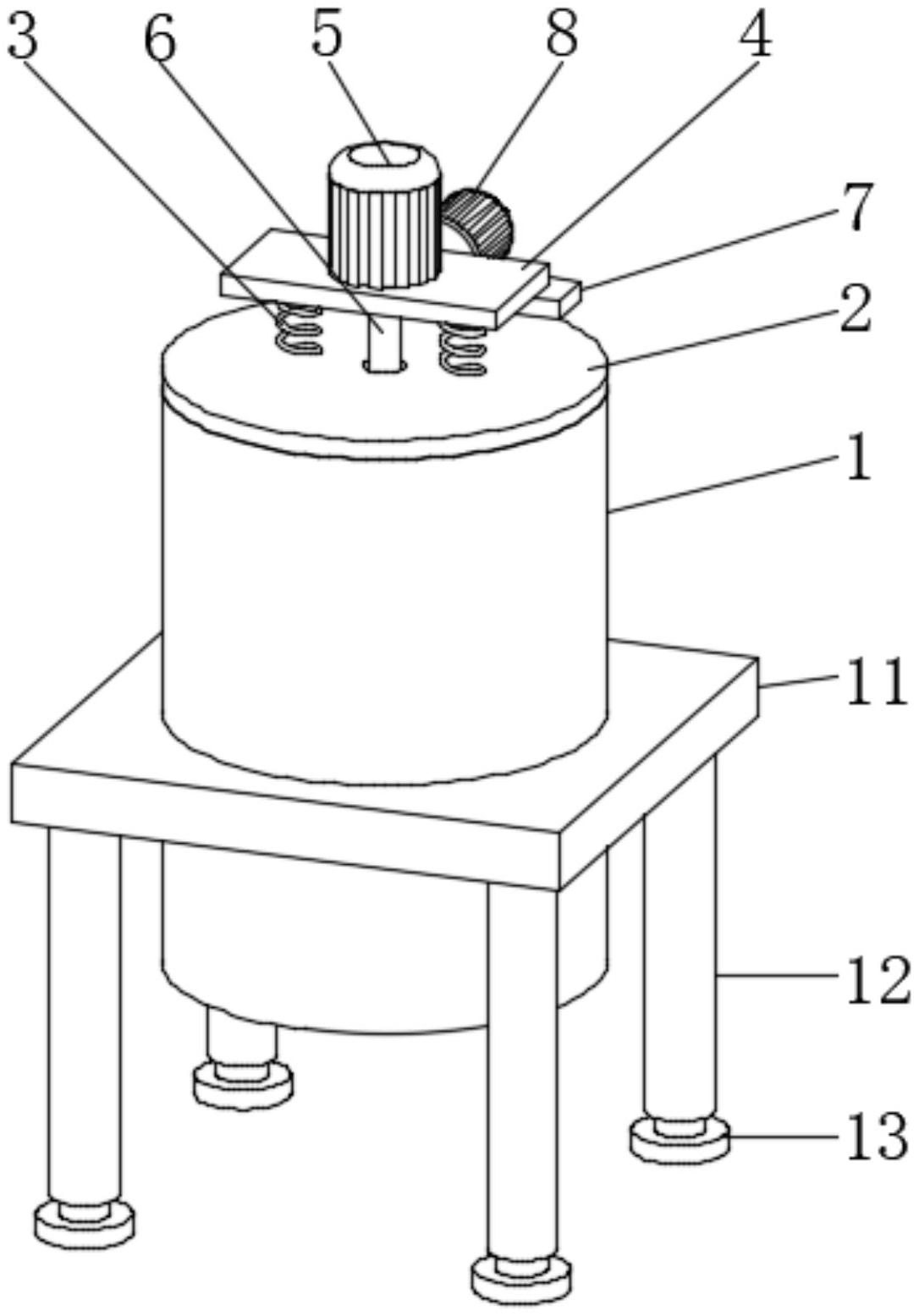 本实用新型公开了一种高分子涂料搅拌机,包括搅拌桶,所述密封盖的顶面两端均固定安装有弹簧,所述弹簧的顶面固定安装有安装板,所述安装板的顶面固定安装有第一电机,所述密封盖的一端顶面固定安装有固定板,所述固定板的顶面固定安装有第二电机,所述第二电机的输出轴顶端固定安装有传动盘,所述传动盘的一侧表面固定安装有固定连接杆,所述固定连接杆的另一端与安装板的一侧表面固定连接。通过设计的弹簧,在装置使用时,第二电机启动,带动安装板上下移动,也就带动第一电机与搅拌轴上下移动,因此可有效的对搅拌轴在搅拌桶内部的位置进行有效的调节,解决了现有的搅拌机无法对搅拌轴的位置进调节导致涂料原料搅拌的效果不理想的问题。