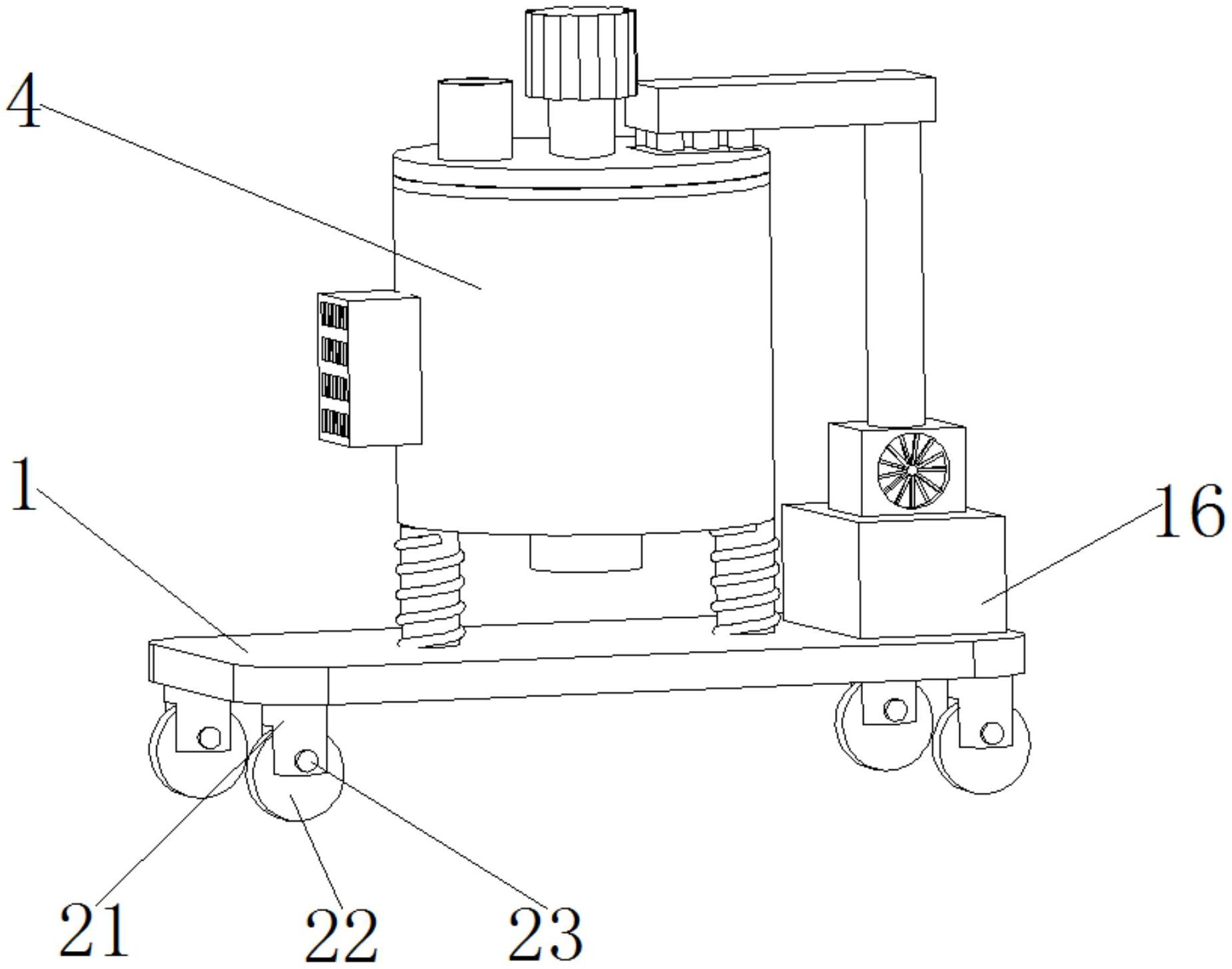 本实用新型涉及防火涂料加工技术领域,且公开了一种控温效果好的防火涂料混合机,包括底座,所述底座上端表面中部位置设有若干固定柱,每个所述固定柱表面均固定安装有减震弹簧,每个所述减震弹簧上端设有混合筒,所述混合筒上端表面设有筒盖,所述筒盖一侧表面中部设有转轴,所述转轴表面中部位置固定安装有螺旋搅拌叶,所述转轴表面两端均固定安装有若干混合搅拌框架,每个所述混合搅拌框架一侧表面均固定安装有刷头,所述转轴一侧表面设有驱动电机,所述混合筒一侧表面中部位置固定安装有偏振电机。