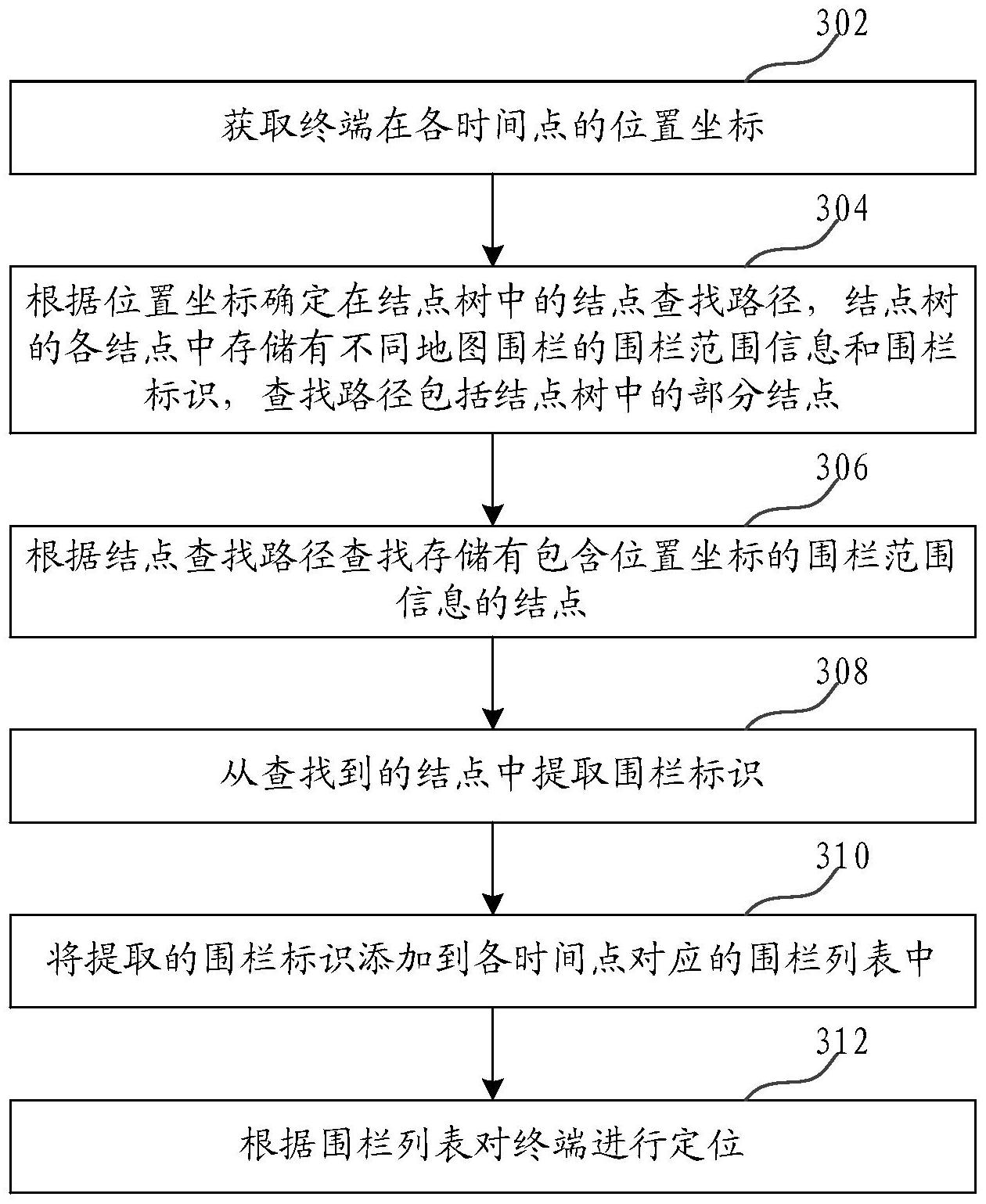 本发明涉及一种基于地图围栏的终端定位方法和装置,所述方法包括:获取终端在各时间点的位置坐标;根据位置坐标确定在结点树中的结点查找路径,结点树的各结点中存储有不同地图围栏的围栏范围信息和围栏标识;查找路径包括结点树中的部分结点;根据结点查找路径查找存储有包含位置坐标的围栏范围信息的结点;从查找到的结点中提取围栏标识;将提取的围栏标识添加到各时间点对应的围栏列表中;根据围栏列表对终端进行定位。本发明提供的基于地图围栏的终端定位方法和装置,无需查找结点树中的所有结点,避免消耗大量的计算资源,节省了计算资源的消耗,并加快了查找围栏标识的速度,提高了对终端的定位效率。