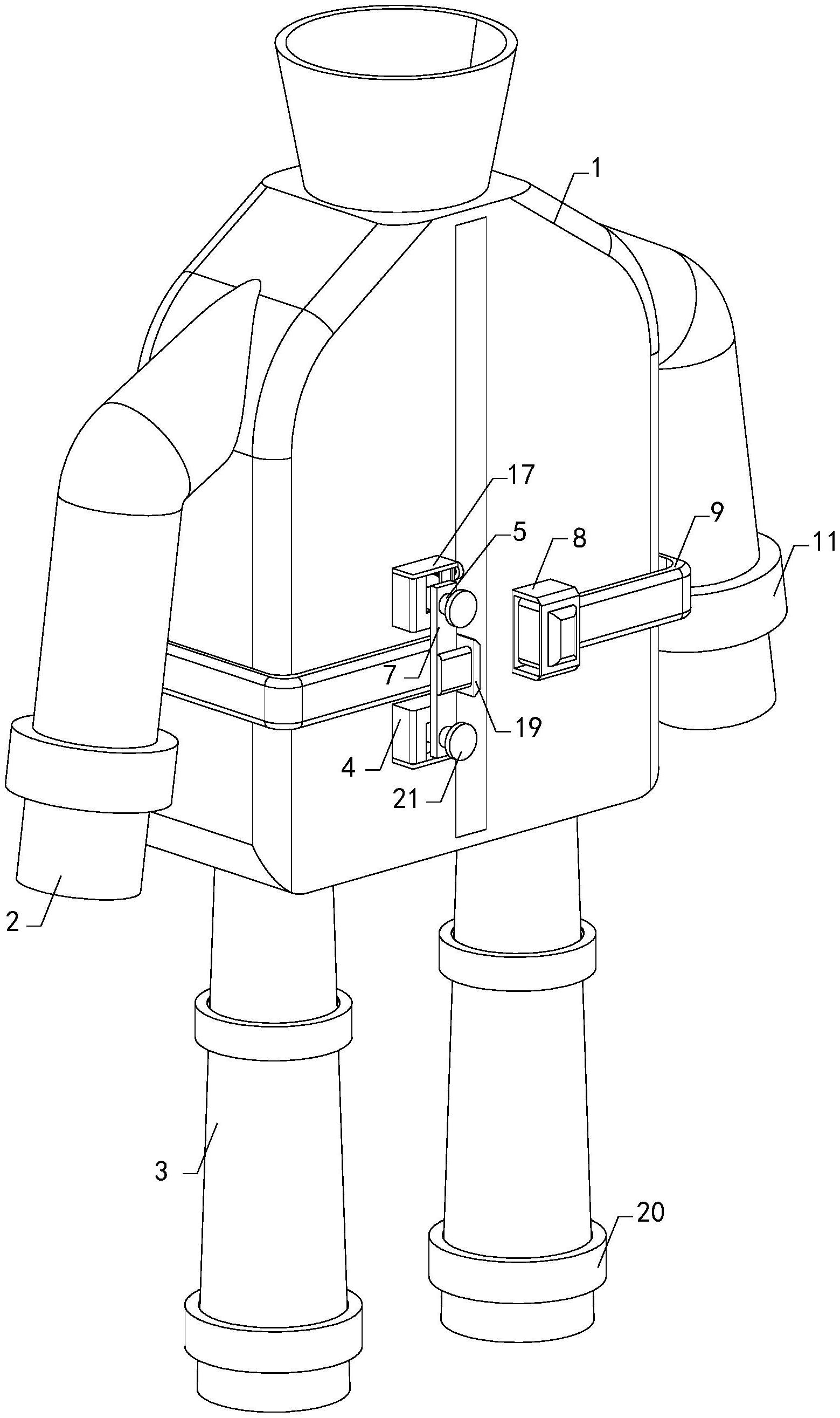 本实用新型涉及消防战斗服技术领域,提出了一种消防战斗服防护结构,其便于减少被困者因为滑落而造成的二次伤害问题,并且便于使被困者对消防员的位置进行获取,包括消防服,消防服上设置有顶部防护服、支部防护服和下部防护服,消防服上连接有两个固定筒,固定筒上设置有固定机构,两个固定筒均可拆卸连接有支撑杆,两个支撑杆上均连接有卡块,两个支撑杆之间设置有连接板,消防服上可拆卸连接有支撑筒,支撑筒上可拆卸连接有定位机构,定位机构与连接板之间设置有弹性带,两个支部防护服上均设置有发光胶带,发光胶带与支部防护服之间设置有防护罩,两个下部防护服上均可拆卸连接有主夜光贴和从夜光贴。