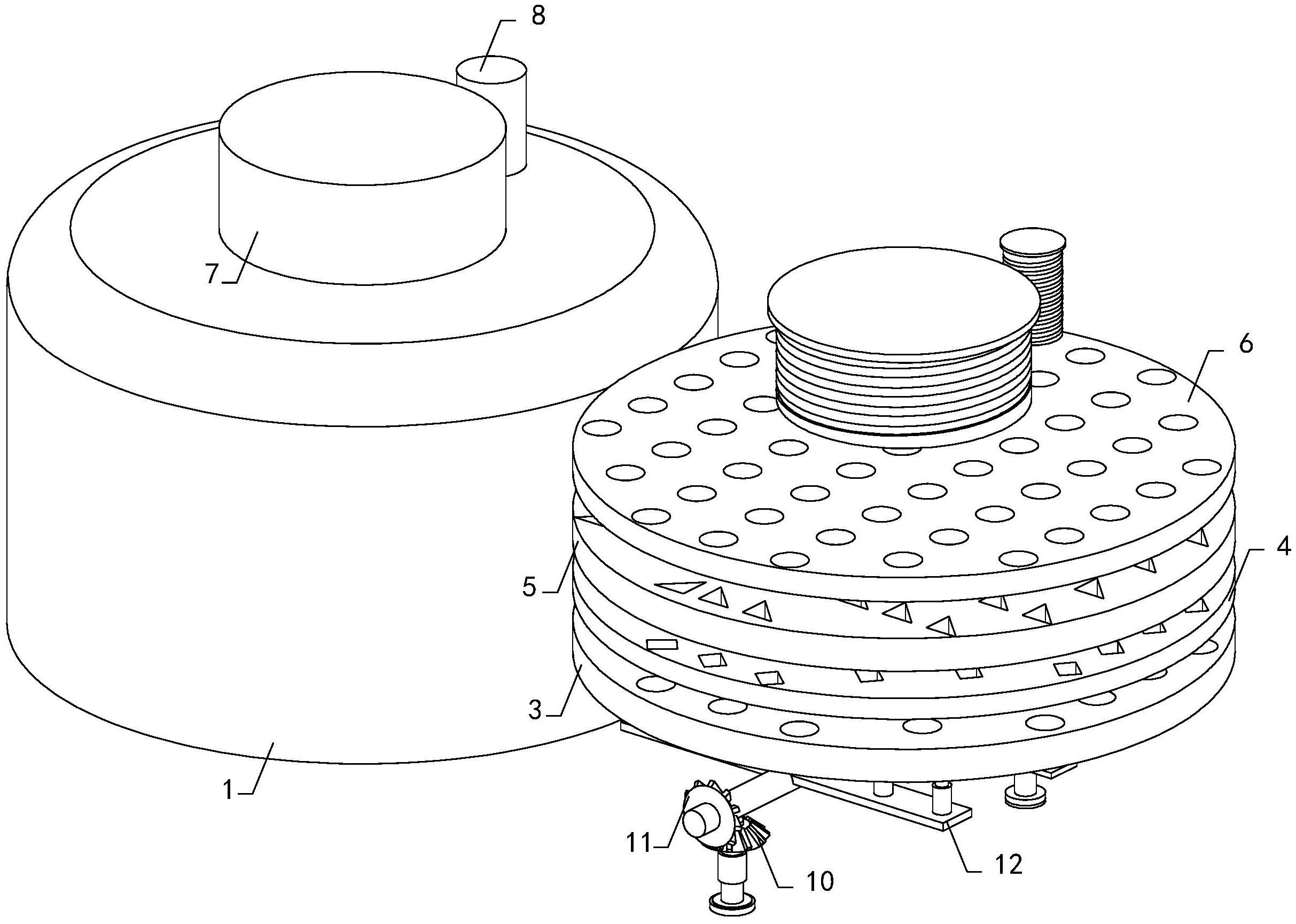 本实用新型涉及滤烟滤毒罐技术领域,提出了一种滤烟滤毒罐,其便于减少烟雾对多孔滤网和进气口的堵塞,包括罐体,罐体的顶端开设有出气口,罐体的底端设置有罐底,罐底上开设有进气口,罐体的内侧壁上可拆卸连接有多孔滤网、活性炭层、药剂层和滤烟层,罐体的顶端开设有排气口,出气口和排气口处分别可拆卸连接有出气盖和排气盖,罐体的内侧壁上转动连接有支撑杆,罐底上贯穿连接有连接杆,连接杆上连接有转动组件,支撑杆和连接杆伸入至罐体的部分上分别套装有主齿轮和从动轮,支撑杆上连接有多个支撑板,多个支撑板上均设置有多个打击机构,支撑杆上对称设置有两个连接板,两个连接板上均设置有从动机构。