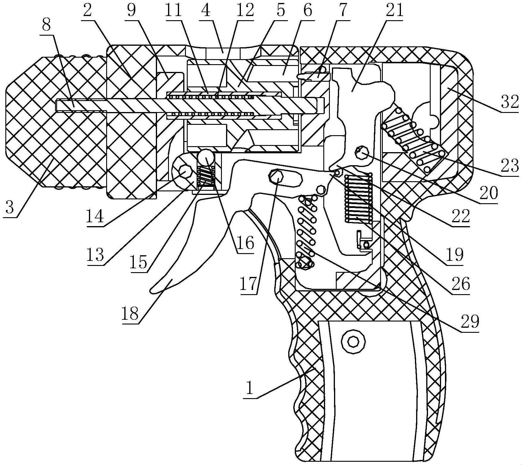 本实用新型涉及体育器材技术领域,具体涉及发令器。具体技术方案为:发令器,包括枪把、与枪把铰接的枪身和与枪身连接的枪头,所述枪身的顶部设置有发射口,所述枪身内转动设置有弹匣,所述弹匣朝向枪把的侧壁上轴向设置有数个装弹腔,所述装弹腔位于弹匣内的一端贯穿所述弹匣的侧壁,且其中一个所述装弹腔与所述发射口对应,所述枪把与弹匣对应的侧壁上设置有击针,所述枪把内设置有撞击击针的击发机构。本实用新型解决了现有技术中扳机扣动时费力的问题。
