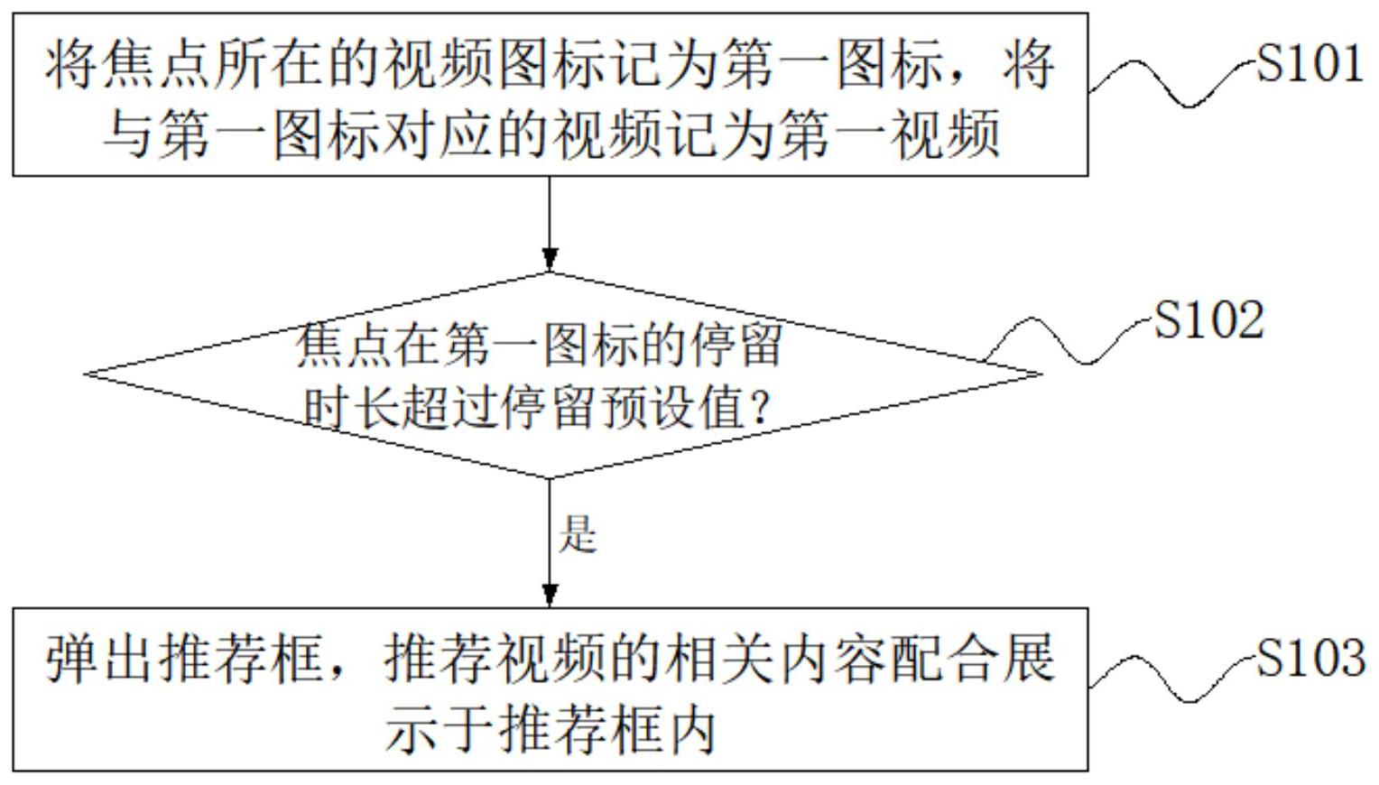 本发明公开了一种基于用户行为预测的视频推荐方法,涉及视频推荐技术领域,用于解决相关技术中为获知与当前视频相类似的视频的方式操作繁琐且所耗时间长的问题。该方法包括:将焦点所在的视频图标记为第一图标,将与第一图标对应的视频记为第一视频,第一视频关联有推荐视频库,推荐视频库内的任意推荐视频与第一视频至少有一个特征要素相同;判断焦点在第一图标的停留时长是否超过停留预设值,若是,则弹出推荐框,推荐视频的相关内容配合展示于推荐框内。本发明不仅可以使得用户通过推荐框获知推荐视频,还具有操作简单且所耗时间短的优点,从而提高用户体验。