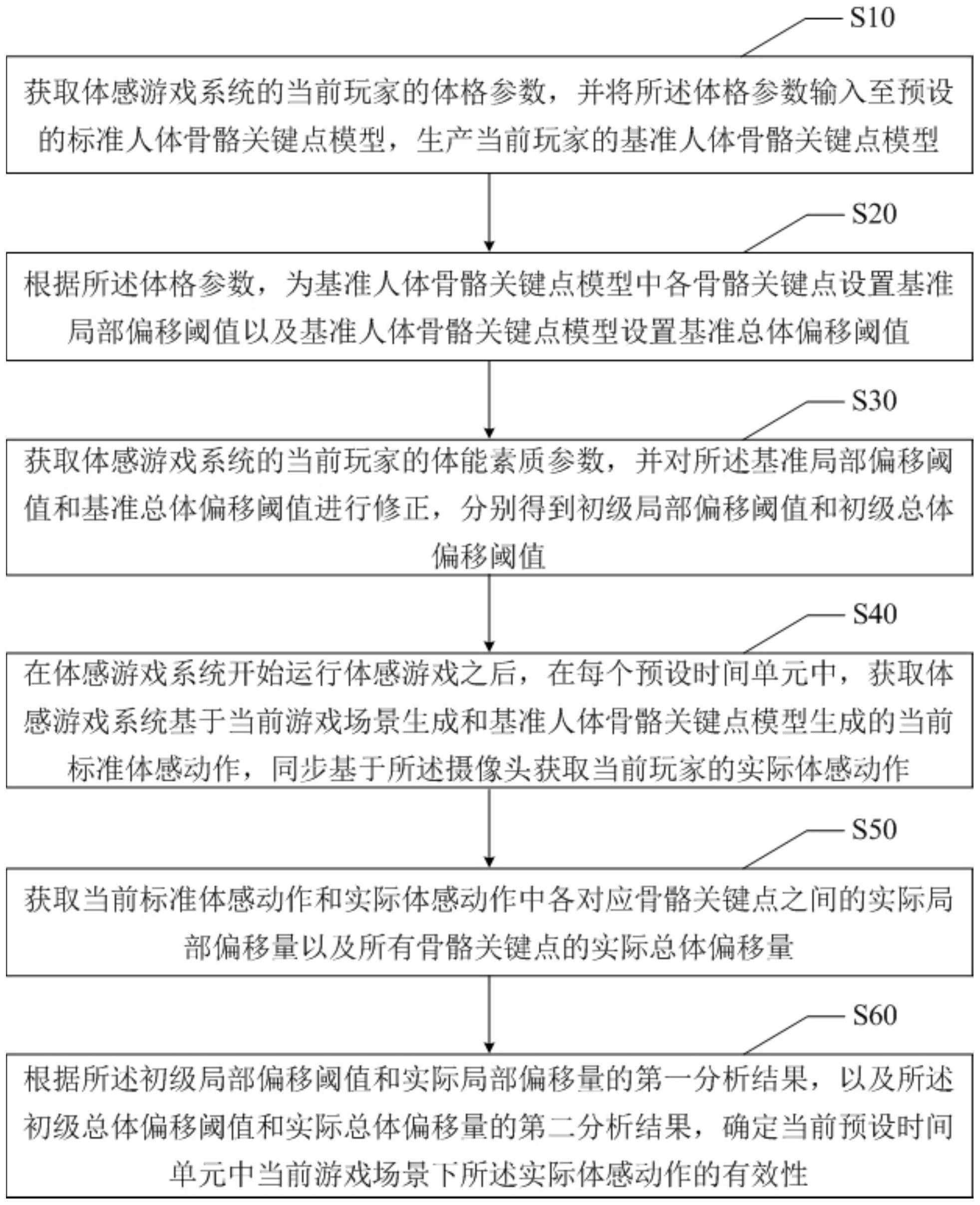 本发明公开了一种基于玩家画像的体感动作识别方法、装置、体感游戏系统及计算机可读存储介质,该方法包括:根据当前玩家的体格参数生成当前玩家的基准人体骨骼关键点模型;根据体格参数,为基准人体骨骼关键点模型中各骨骼关键点设置基准局部偏移阈值以及基准人体骨骼关键点模型设置基准总体偏移阈值;得到初级局部偏移阈值和初级总体偏移阈值;在体感游戏系统开始运行体感游戏之后,在每个预设时间单元中,获取当前标准体感动作和实际体感动作;获取实际局部偏移量以及实际总体偏移量;根据第一分析结果和第二分析结果,确定当前预设时间单元中当前游戏场景下实际体感动作的有效性。本发明体感动作识别更灵活、更贴合玩家需求。
