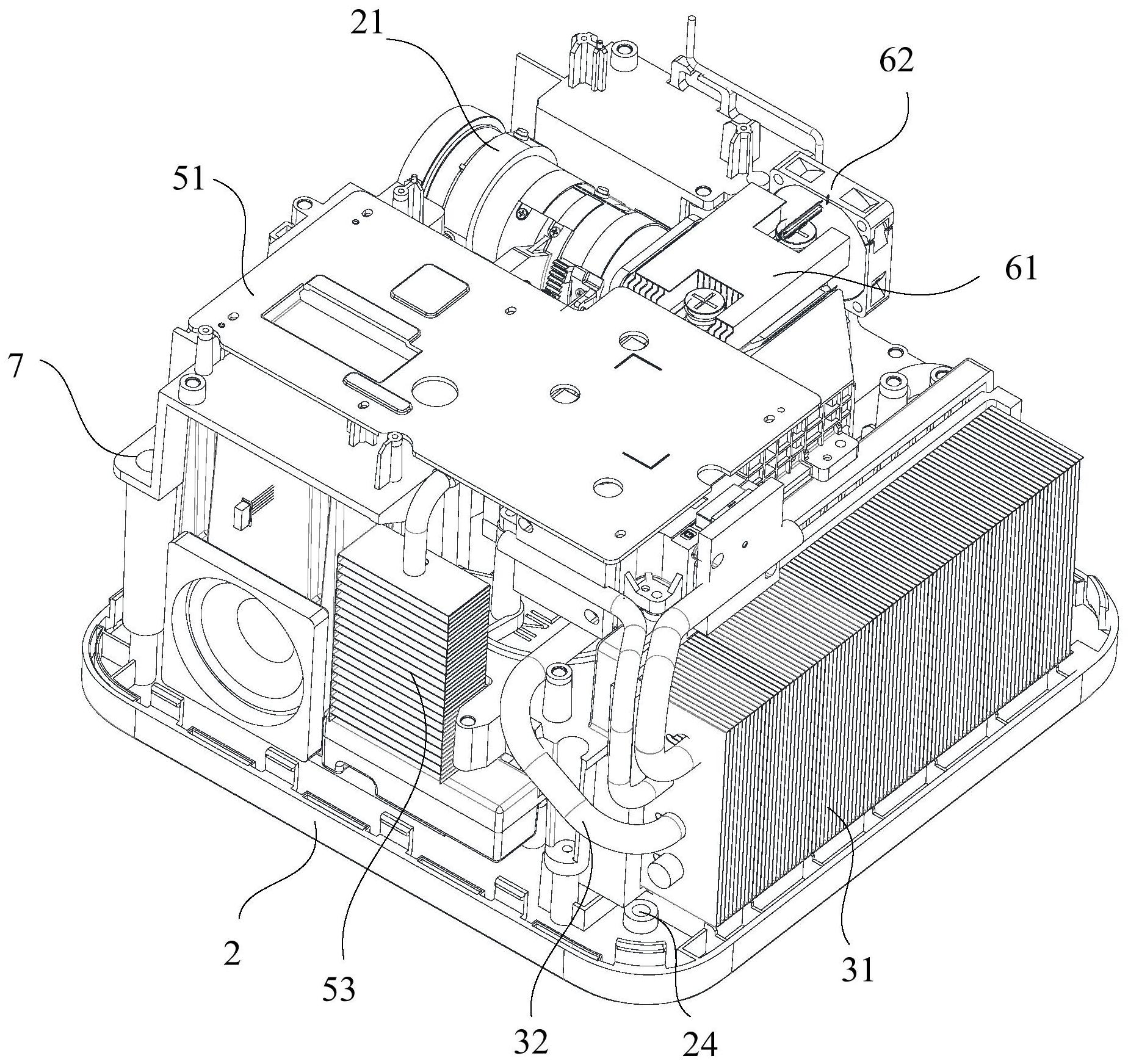 本发明公开一种智能投影设备,智能投影设备包括:壳体,壳体一侧设有散热出口;底板,壳体盖设于底板上,底板上设置光机模组、印制电路板PCB和数字微镜元件DMD,底板开设进气孔;第一散热组件,第一散热组件包括第一散热件、第一散热管、第一介质和主散热风扇,进气孔、壳体内壁、主散热风扇和散热出口共同构成散热通道;第二散热组件,第二散热组件包括设置于散热通道中的均温板、第二散热管、第二介质和第二散热件;第三散热组件,第三散热组件包括设置于散热通道中的辅助散热件和辅助散热风扇。本发明技术方案升散热效果、以降低壳内温度。