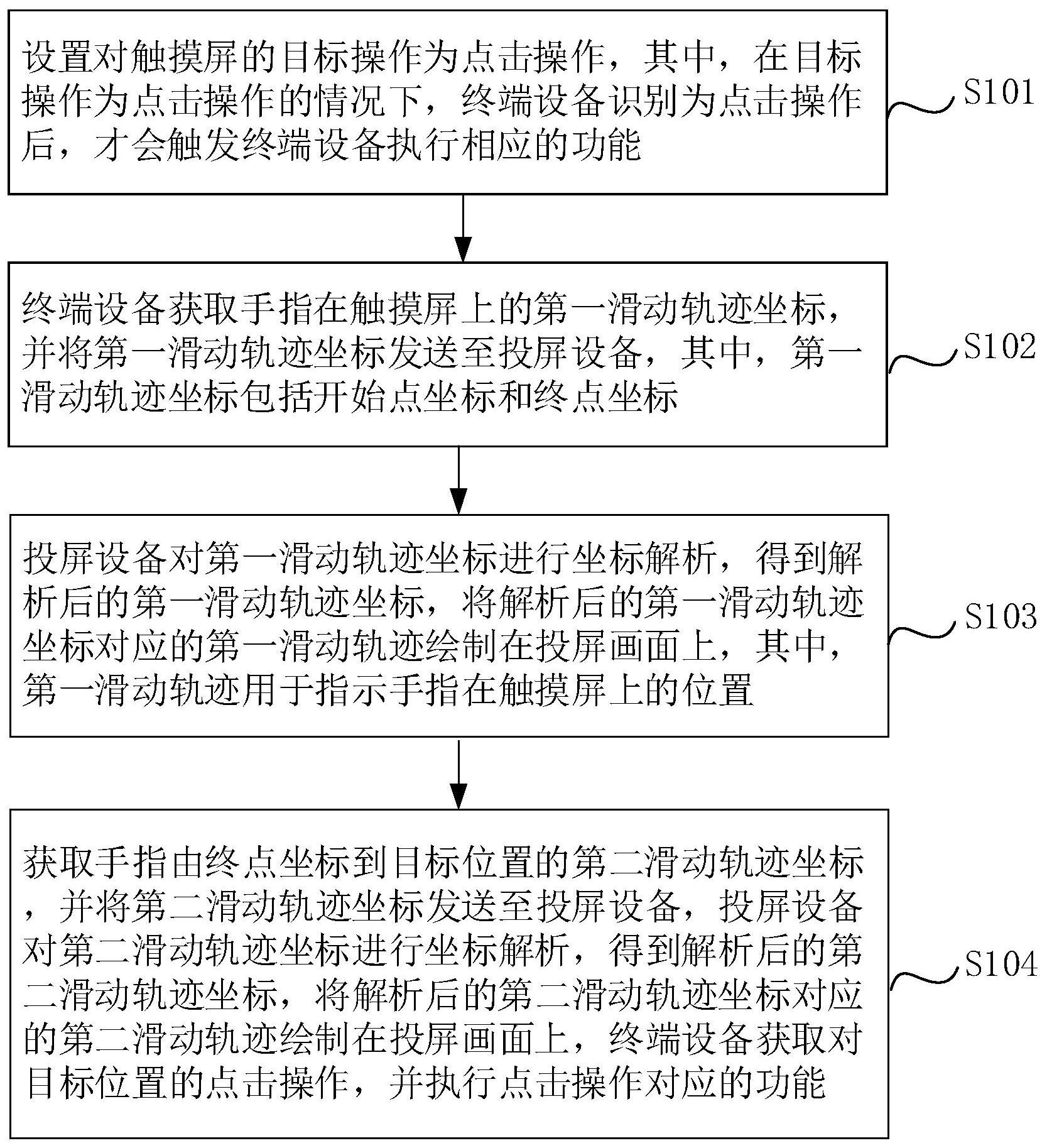 本申请涉及一种终端设备的控制方法和控制系统,通过设置对触摸屏的目标操作为点击操作后,滑动操作不会触发终端设备动作;终端设备获取手指在触摸屏上的第一滑动轨迹坐标后发送至投屏设备,其中,第一滑动轨迹坐标包括开始点坐标和终点坐标;投屏设备将解析后的第一滑动轨迹坐标对应的第一滑动轨迹绘制在投屏画面上,获取手指由终点坐标到目标位置的第二滑动轨迹坐标后发送至投屏设备,投屏设备将第二滑动轨迹绘制在投屏画面上,终端设备获取对目标位置的点击操作,并执行点击操作对应的功能,解决了将终端设备的触摸屏上显示的内容投屏到屏幕上后,用户需经常在低头操控手机和抬头观看屏幕之间切换,导致用户操作终端设备不灵活的问题。