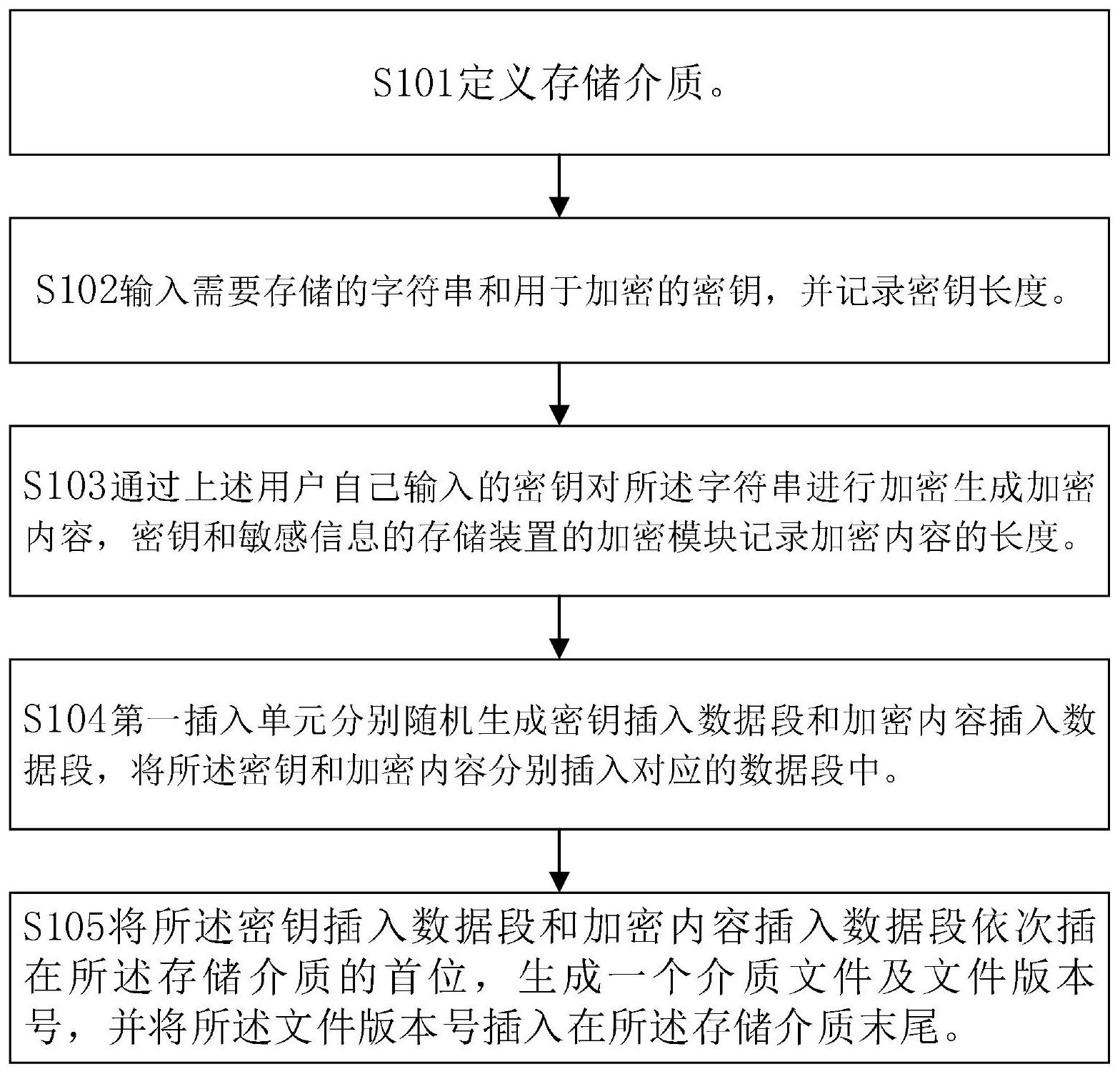 本申请实施例公开了一种密钥和敏感信息存储、读取方法及装置,使用户可以自定义键对存储介质进行加密,然后通过拆分数据将密钥和加密内容分别插入存储介质中生成介质文件,在读取过程中同样通过验证介质文件的版本号来依次读取拆分的密钥和加密信息,最终再通过密钥对加密信息解密获得字符串,生成可以被读取、查看和使用的存储介质。本申请实施例提供的密钥和敏感信息存储方法,使得用户可以自定义加密信息存储介质和自定义键值对来加密内容,提高密钥安全性,改善现有技术中本地存储密钥不安全的问题,同时也克服了使用服务器端存储加密信息时效性差的问题。