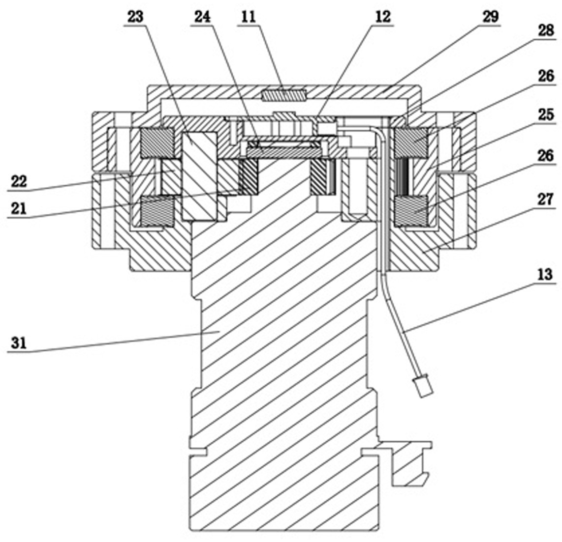 本实用新型属于机器人和人工智能领域,特别是涉及一种机器人关节减速输出机构,包括电机、行星减速器装置和位置反馈装置,行星减速器装置包括太阳齿轮、行星齿轮组、行星轴、销钉、内齿圈、角接触轴承、行星架基座、行星架压盖和输出端法兰盘,位置反馈装置包括磁性元件、磁编码器和信号连接线。其中,电机的电机输出轴与太阳齿轮固定,太阳齿轮带动行星齿轮组转动,实现第一次减速、增大扭矩;行星齿轮组带动内齿圈转动,实现第二次减速、增加扭矩;内齿圈与输出法兰盘固定,输出端法兰盘随内齿圈一同转动。输出端法兰盘安装有磁性元件,磁编码器正对着磁性元件安装于行星架压盖内,实时读取输出端法兰盘的角度位置,配合驱动器实现高精度控制。