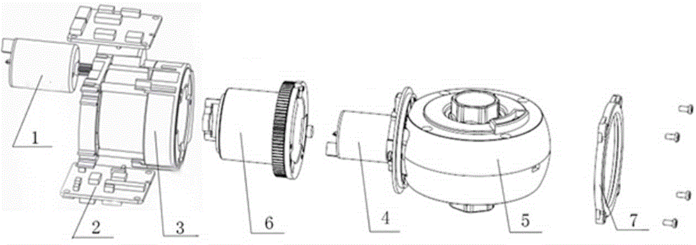 本实用新型属于机器人和人工智能技术领域,特别是涉及一种双发式球形关节。包括马达一(1)、驱动板(2)、减速箱一(3)、马达二(4)、减速箱二(5)、转接齿轮组件(6)和盖圈(7),其中马达一(1)通过减速箱一(3)减速;减速箱一(3)内部空间大,马达二(4)固定在其内部,二者可合为一个整体;马达二(4)通过减速箱二(5)减速,各部件组成一种新的整体关节模块,该关节模块将两个原本相互垂直的独立自由度的转动运动机构整合在一起。