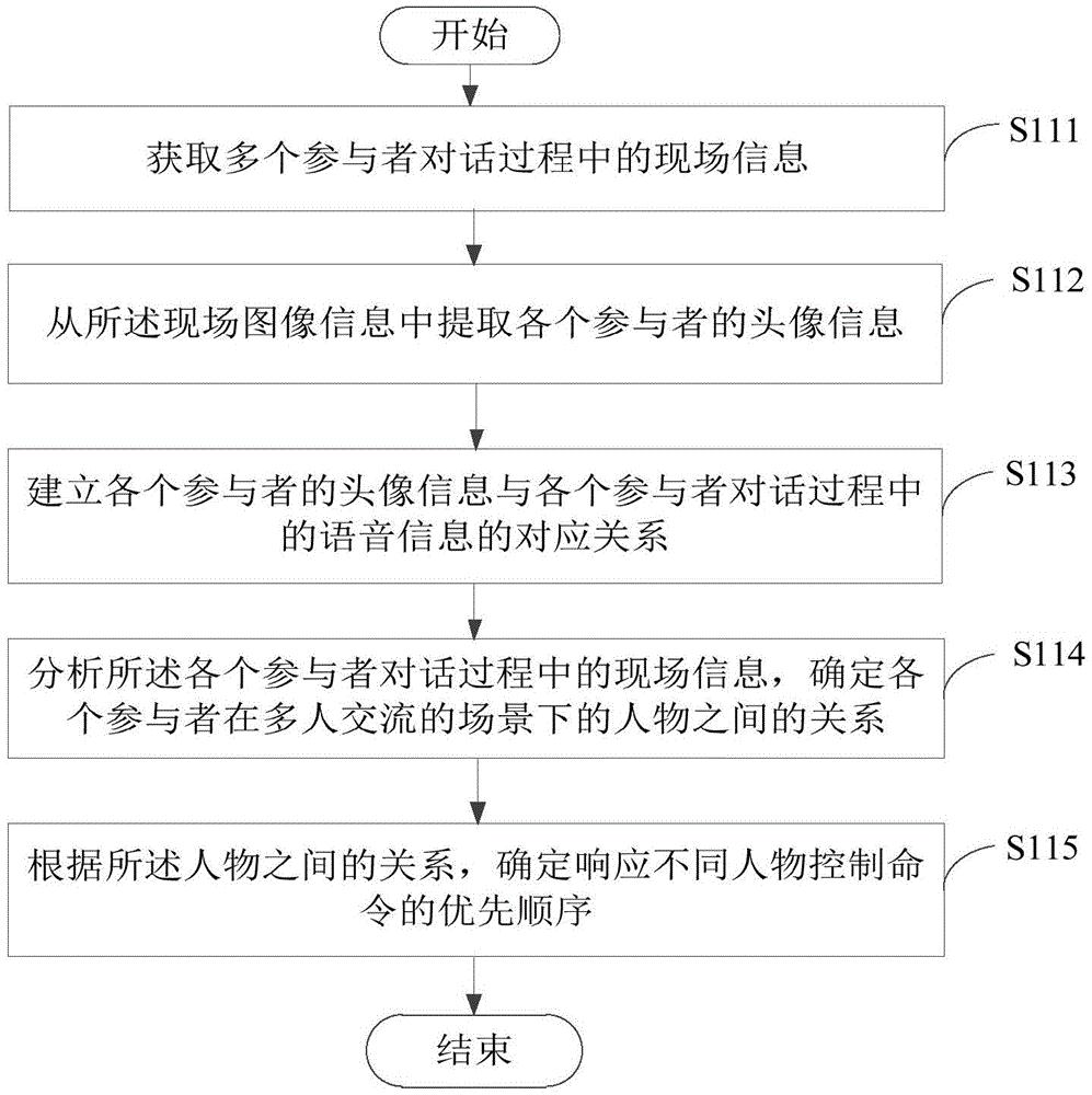 本发明提出一种确定响应控制命令优先顺序的方法及装置。该方法包括:获取多个参与者对话过程中的现场信息;从所述现场图像信息中提取各个参与者的头像信息;建立各个参与者的头像信息与各个参与者对话过程中的语音信息的对应关系;分析所述各个参与者对话过程中的现场信息,确定各个参与者在多人交流的场景下的人物之间的关系;根据所述人物之间的关系,确定响应不同人物控制命令的优先顺序。本发明提供的技术方案可以自动判断响应控制命令的先后顺序,不需要事先进行设定,或者事后进行频繁的修改,具有智能、便捷的特点。