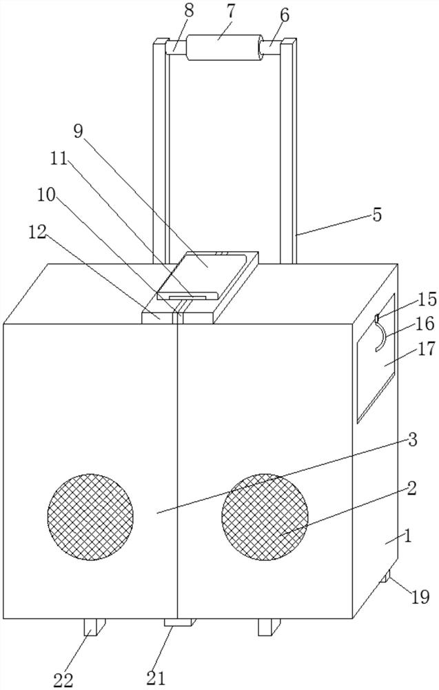 本实用新型公开了一种基于TWS无线音频传输的高品质立体声音频设备,包括第一主体和第二主体,所述第一主体和所述第二主体的内部均设有喇叭,所述第一主体和所述第二主体的顶端设有第一固定机构,所述第一主体和所述第二主体的底端设有第二固定机构,所述第一主体和所述第二主体的一侧设有拉杆,所述第一主体和所述第二主体的内部设有TWS芯片,所述第一主体和所述第二主体的内部设有隔板,所述第一主体和所述第二主体的一侧均开设有第一开口,第一开口的底部转动连接有转动轴。本实用新型通过设置第一主体和第二主体,使用时,可以将第一主体和第二主体分开,此时使第一主体和第二主体上的喇叭形成立体声,通过TWS芯片可以对音频进行输出。