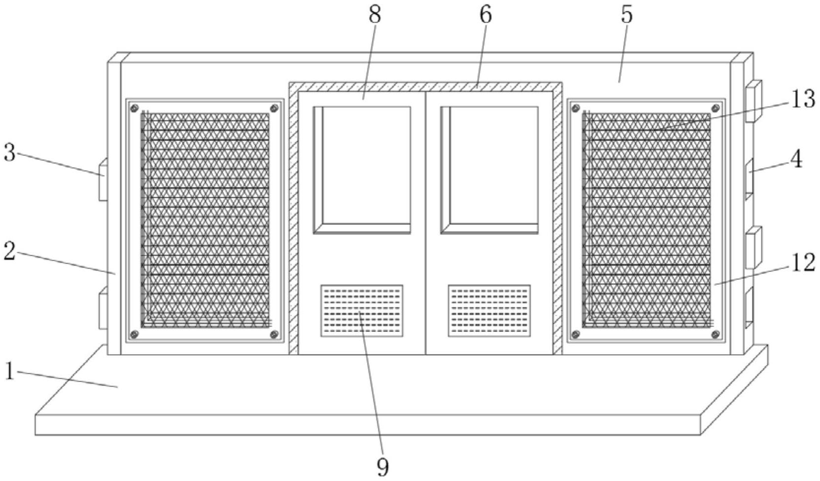 本实用新型属于屏蔽门技术领域,尤其为地铁安全屏蔽门,包括落客站台,落客站台顶面的左右两端均固定栓接有支撑柱体,支撑柱体的外侧面固定焊接有锁定块,支撑柱体的外表面开设有锁定槽,支撑柱体的内侧面固定栓接有主体框架,主体框架正面的中部固定栓接有门架。本实用新型通过防护框体的设置,利用钢丝网的防护作用,在玻璃本体因为意外发生破碎时,钢丝网能够将因破碎而产生玻璃本体的大体积碎片进行阻隔,让破碎后的玻璃本体不会掉落到落客站台的一侧或者地铁轨道内,可以有效的防止玻璃本体的破碎对人员造成伤害,并且不会因为玻璃本体掉落至轨道内对地铁的运行造成影响,从而提高了该屏蔽门的实用性。