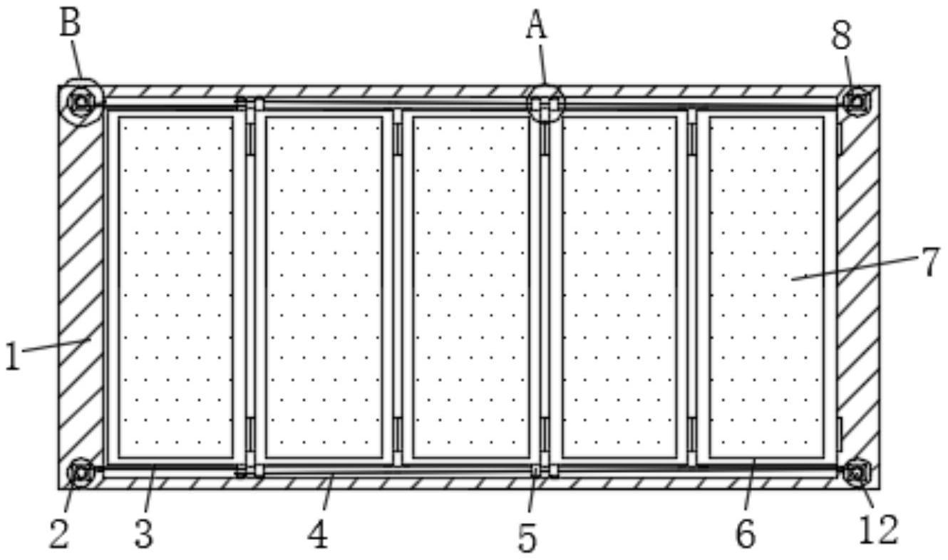 本实用新型属于折叠门技术领域,且公开了一种多扇门的自动折叠装置,包括门框体,所述门框体的内部设有六个依次铰接的门架,所述门架的内部安装有玻璃,所述门框体的内部上下壁对称开设有滑槽,所述门框体的上下壁均设有滑动组件,所述滑动组件用于限定门架折叠与张开时的移动方向,所述门框体的内部还安装有驱动组件,所述驱动组件用于驱动门架的折叠与打开,本实用新型通过上下两组由第一电机、第一卷辊和第一拉绳组成的张开驱动部分可上下同时施力将门架张开,通过上下两组由第二电机、第二卷辊和第二拉绳组成的折叠驱动部分,可上下同时施力将门架折叠,门的关闭与打开均稳定快速,能够避免受力不均而发生卡死的缺陷。