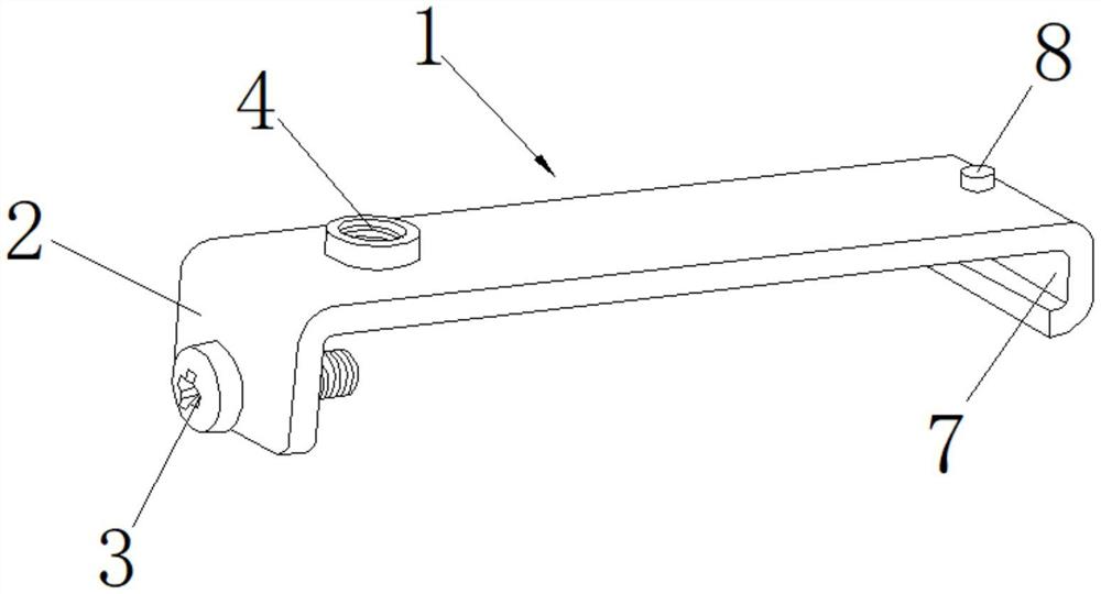 本实用新型公开了一种固定排插在异形导轨升降台的金属支架,包括支架本体,所述支架本体的一端向下折设有折弯部,所述折弯部设有用于与异形支架一侧配合固定的支撑螺丝,所述支架本体的一端贯穿设有与排插底面连接的螺丝孔,所述支架本体的另一端向内折弯形成用于与异形支架另一侧配对安装的U形挂钩。本实用新型的结构简单,安装方便,制作成本低,实用性强,桌面排插通过支架与异形支架的导轨配合连接固定,解决了传统排插在可升降交易台异形轨道上的安装难题。