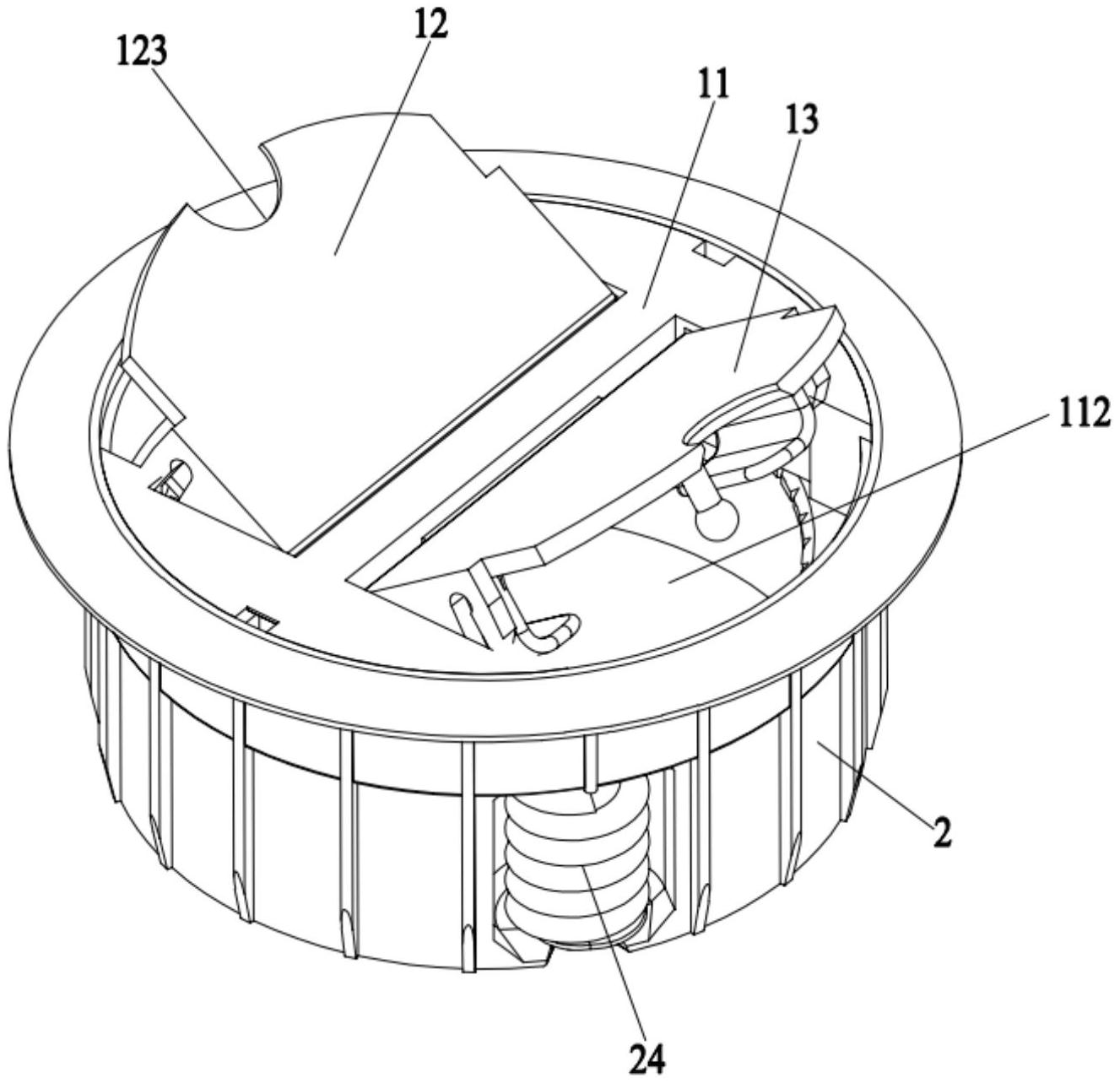 本实用新型涉及接线盒技术领域,具体涉及一种分布式地板接线盒,包括旋转芯和外壳,外壳的内侧壁设置环向卡板将外壳的内分割为上置容腔和下置容腔,环向卡板设有若干均匀分布的限位卡槽,旋转芯的下端部设有向下延伸的卡扣,旋转芯嵌设于上置容腔内并通过卡扣卡设于环向卡板,且旋转芯能在上置容腔内旋转。本实用新型的接线盒结构简单、新颖、使用方便,通过设置能相对外壳内外壳内转动的旋转芯向外拉线可以实现合理布线,遇到狭小空间若接线头发生干涉时,可以适当转动旋转芯,便可有效地避开外围空间的干涉而将接线头合理布局在混凝土地板或混凝土墙壁内,适用范围广,具有很好的市场前景。