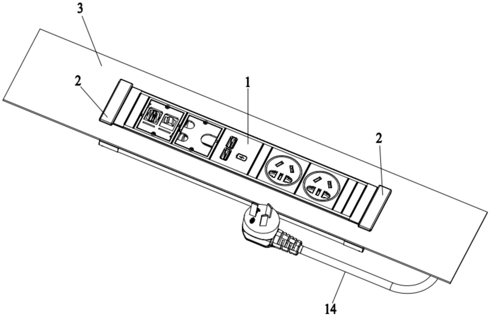 本实用新型涉及插座技术领域,具体涉及一种按在超薄桌面的内嵌式插座,包括插座模块和设置在插座模块两端的卡扣件,卡扣件包括一体成型的基板、卡扣部和固定柱,固定柱设置于基板的下端面,卡扣部设置于基板的下端面,卡扣部分别位于固定柱的一侧,基板的两端延伸设有卡板部,插座模块的两端对应于固定柱设有固定插孔,固定柱设置于固定插孔内。本实用新型的内嵌式插座结构简单、使用方便,通过在插座模块的两端设置卡扣件可以将内嵌式插座安装于各种桌面,既节省空间,也使桌面显得整洁,在固定时利用卡板部卡合在桌面的上表面,卡扣部卡何在桌面的下表面,将插座内嵌固定于桌面的安装部,解决了以往采用螺钉固定方式破会桌面完整性的问题。