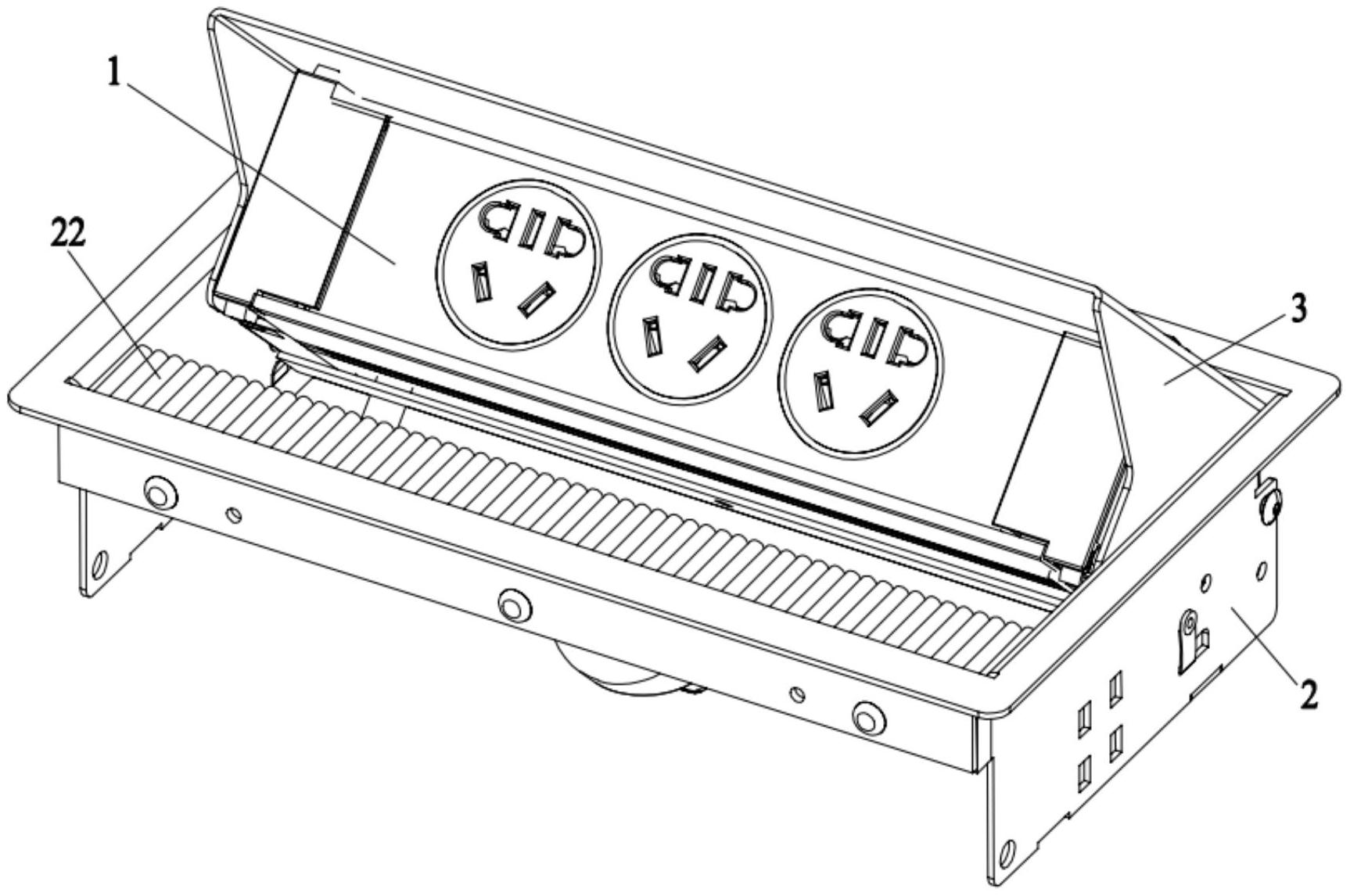 本实用新型涉及办公设备技术领域,具体涉及一种多功能桌面隐藏式插座装置,包括插座模块、安装座和插座安装盒,插座模块包括模块可更换插座,以及设在模块可更换插座两端的端头固定件,端头固定件的两侧设有弹性卡扣件,插座安装盒内对应于弹性卡扣件设卡口,插座安装盒设置于安装座内,安装座设有开口向上的置容腔,插座安装盒的两端通过转轴设置于置容腔内且能在置容腔内绕转轴翻转。本实用新型的插座装置结构简单、使用方便,插座模块与插座安装盒之间通过利用弹性卡扣件实现卡合固定,方便插座模块的取放,维修或更换时可有效避免以往整体更换座装置的弊端,可以实现插座模块的随意更换,适用范围广,具有很好的市场前景。
