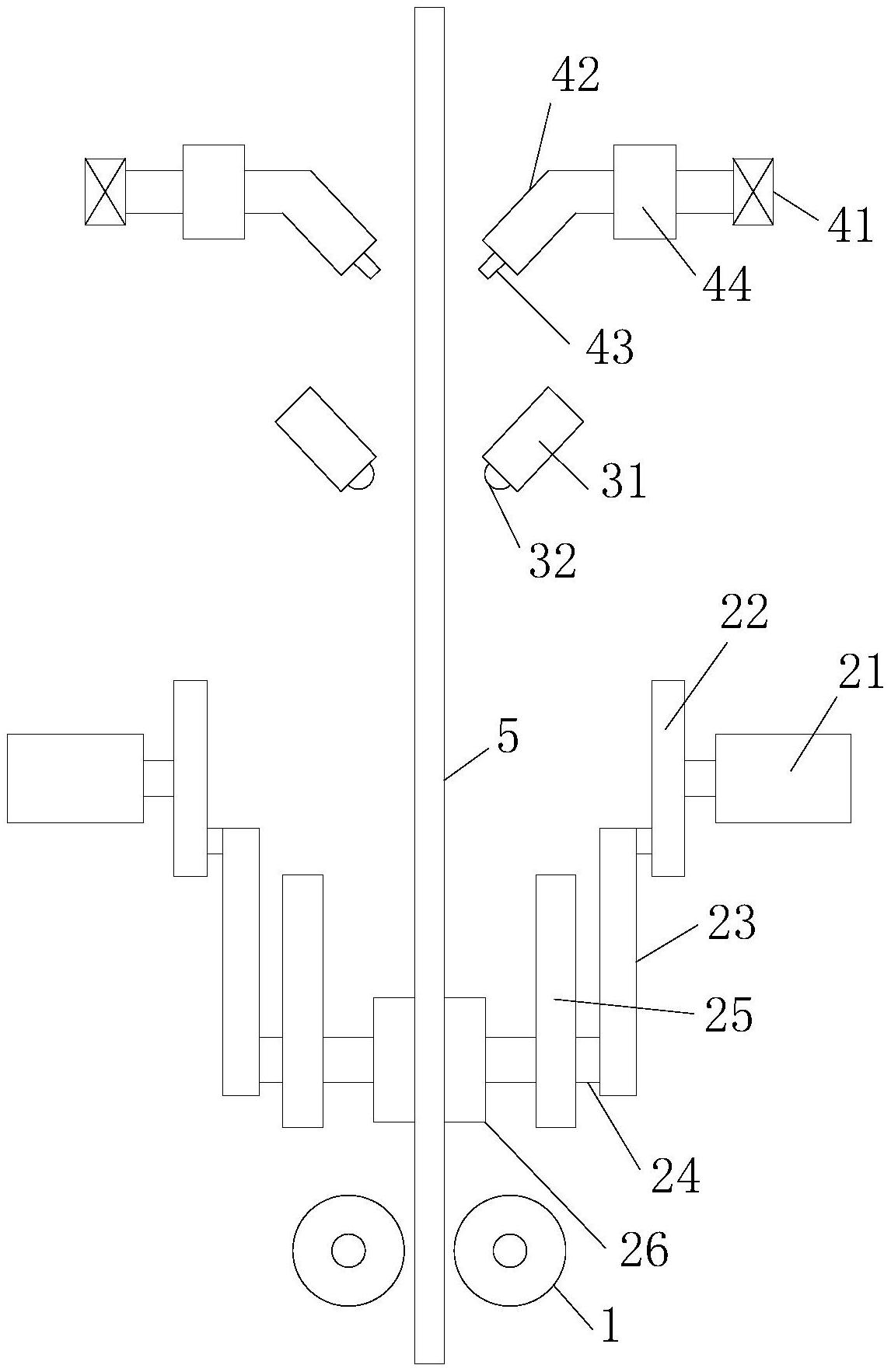 本实用新型公开了一种提高铜带表面质量的处理装置,涉及铜带制造技术领域,包括:两个对称设置的轧制部和两个对称设置的抛光部,其中,所述轧制部包括第一电机,所述第一电机传动连接有卷辊;所述抛光部包括第二电机,所述第二电机的转动轴上设有转盘,所述转盘铰接有第一连杆,所述第一连杆的下端铰接有第二连杆,所述第二连杆滑动连接有定位块,所述第二连杆远离所述第一连杆的一端设有抛光片。本实用新型在铜带轧制后,可以对铜带表面进行自动的抛光作业,提升了铜带表面的质量。