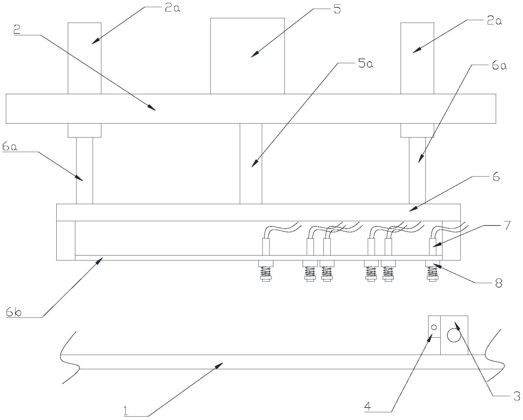 本实用新型提出了一种大电流检测装置,包括传送带和位于传送带上方的固定机架,固定机架上设有上下伸缩的第一气缸,第一气缸的伸出端穿过固定机架并固定连接有框型固定架,框型固定架的顶部竖向设有导向杆,固定机架上设有外套在导向杆上的固定套,框型固定架的底部为左右延伸的检测端头固定杆,检测端头固定杆上沿传送带的传送方向依次间隔设置的偶数个检测端头,偶数个检测端头两两一组,用于检测各个蓄电池的正负极,传送带一侧固定设置有前后伸缩的用于阻挡蓄电池的第一阻挡气缸,第一阻挡气缸位于检测端头的右侧,第一阻挡气缸的左侧紧邻设置有第一接近开关。
